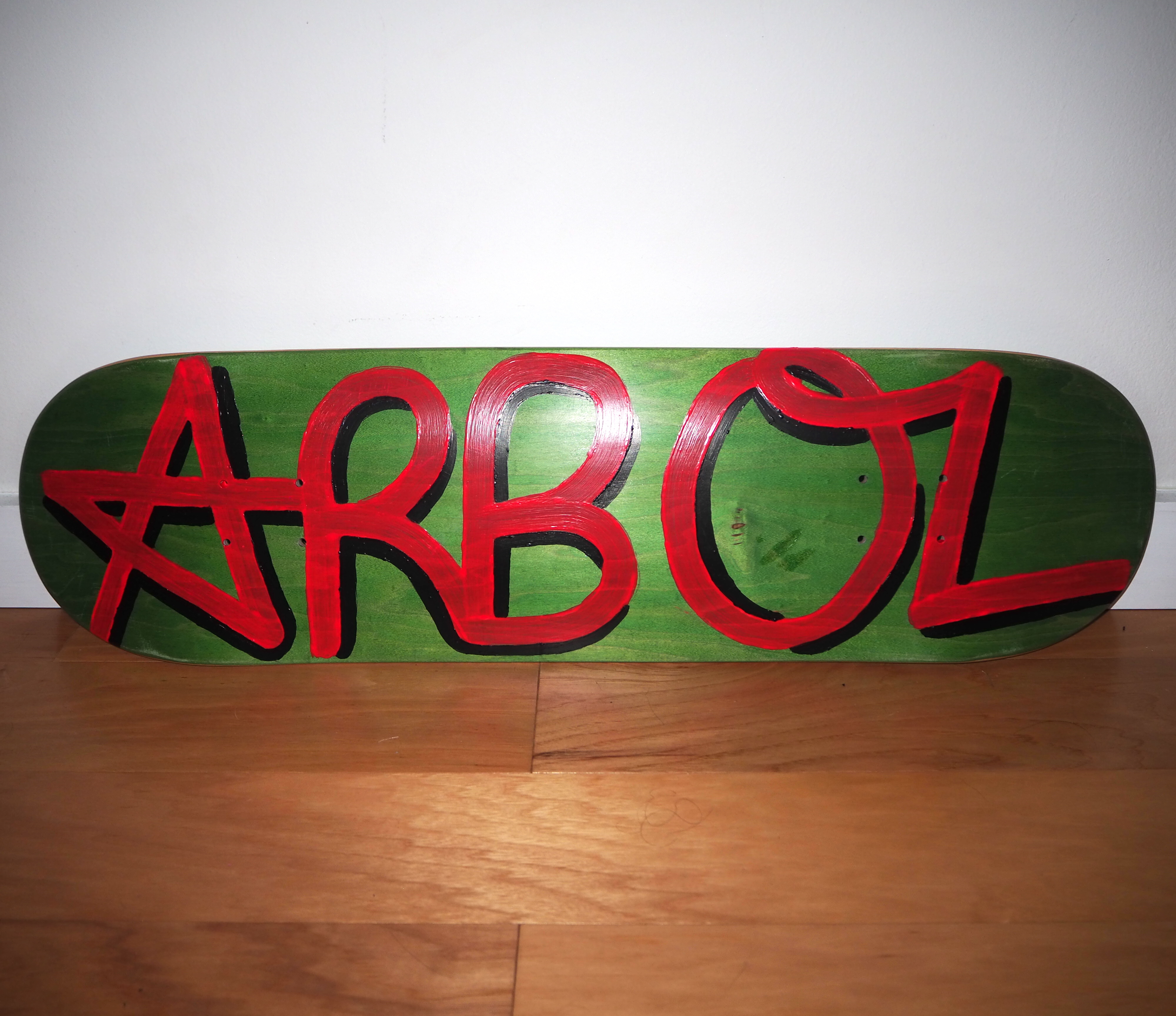 ARBOL shop deck. Hand painted skateboard. Pink and black paint on a green skateboard. size is 8.75