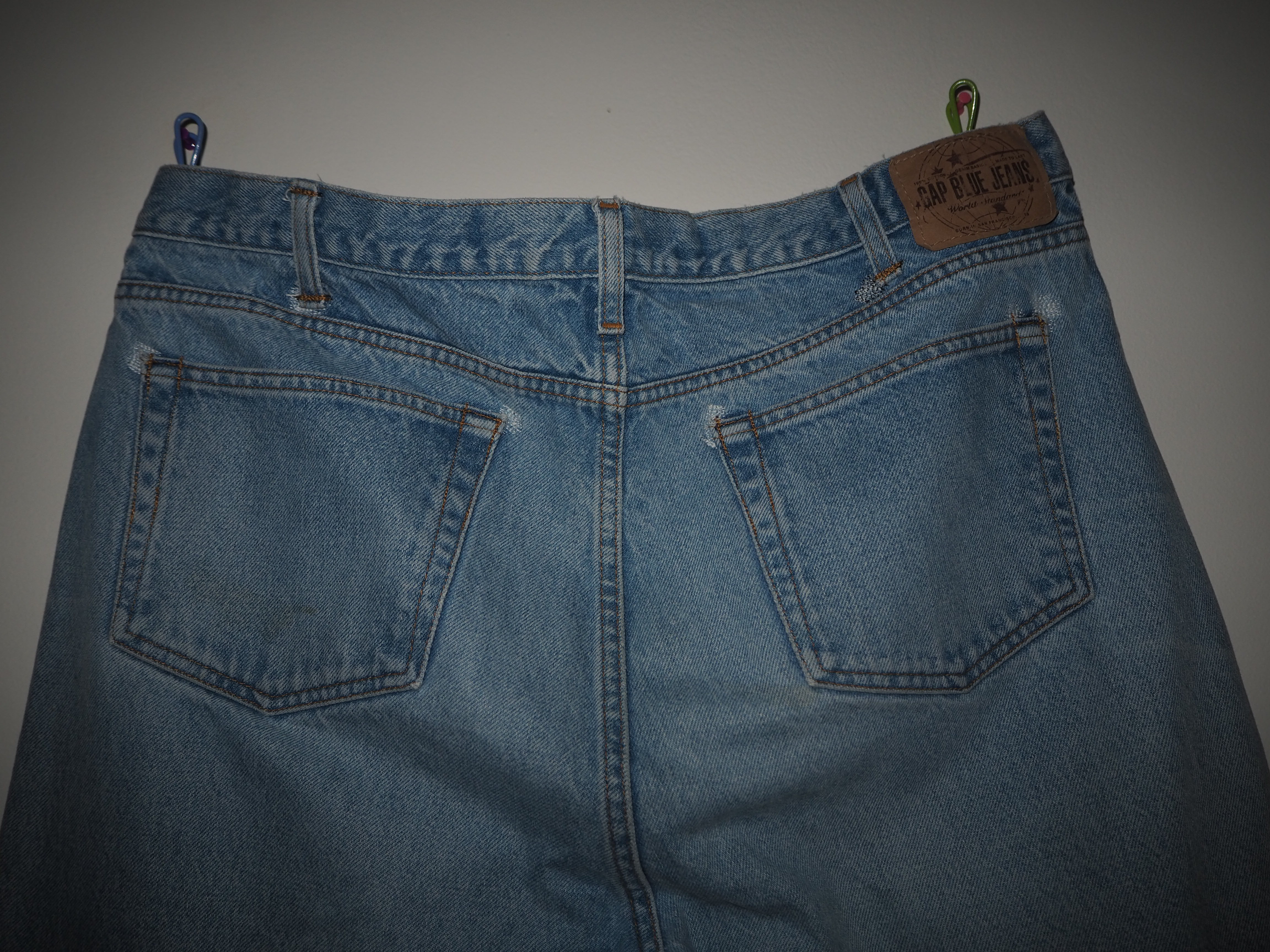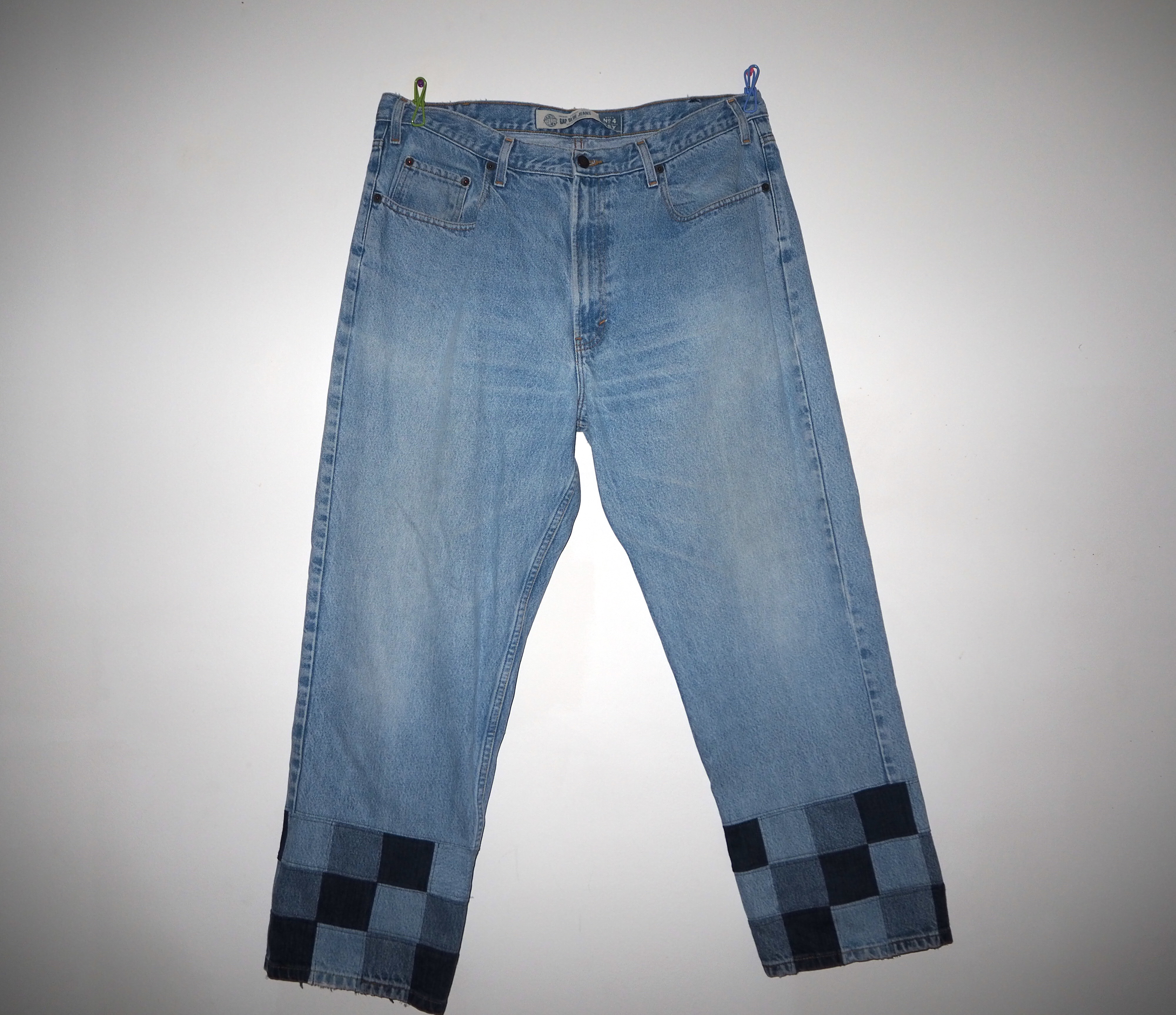 Checkered cuffs. I cut the bottom of the pants off and made some checkered denim fabric and sewed them back on. Minecraft and 90’s vibes. All machine sewn. I also repaired the back pocket stress points. Made on old gap blue jeans. Fits 38 x 30.