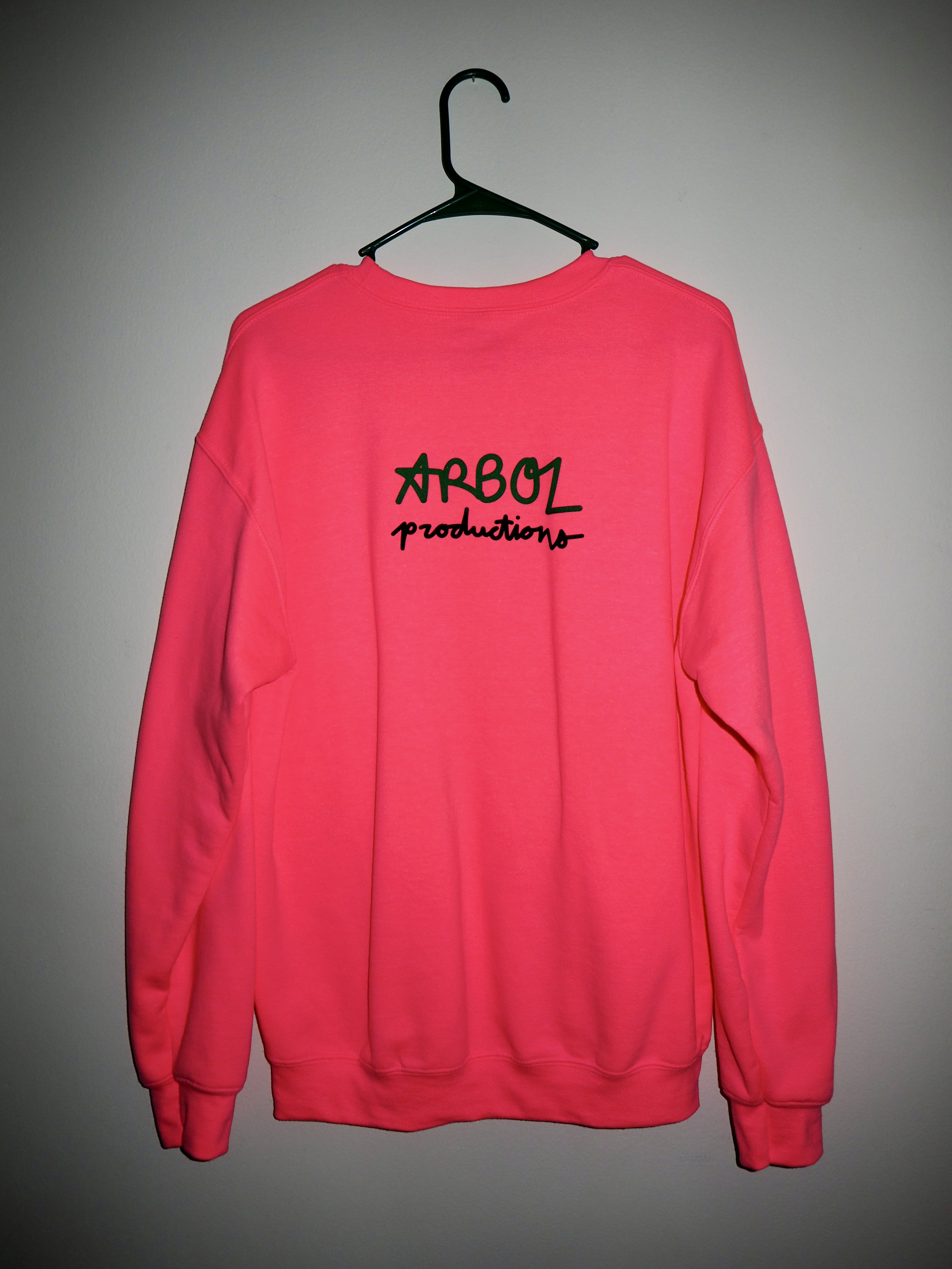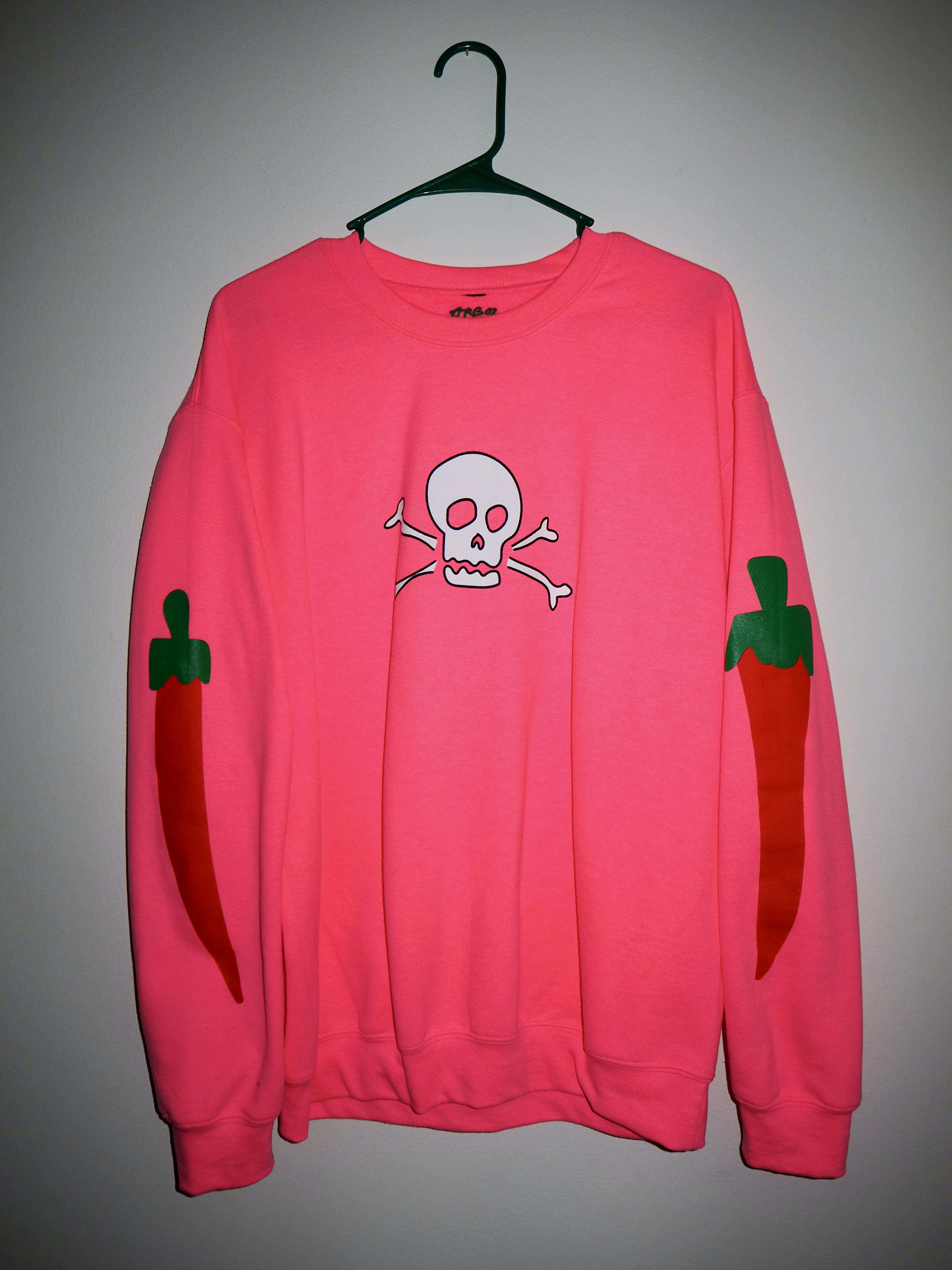Inspired by construcion workers and mexican restaurants. This is my version of a work shirt. Skull and crossbones printed in the center chest with Arbol chile peppers printed down the sleeves and an ARBOL productions back hit finished with an inside neck label. Everything is hand drawn and screen printed by me.