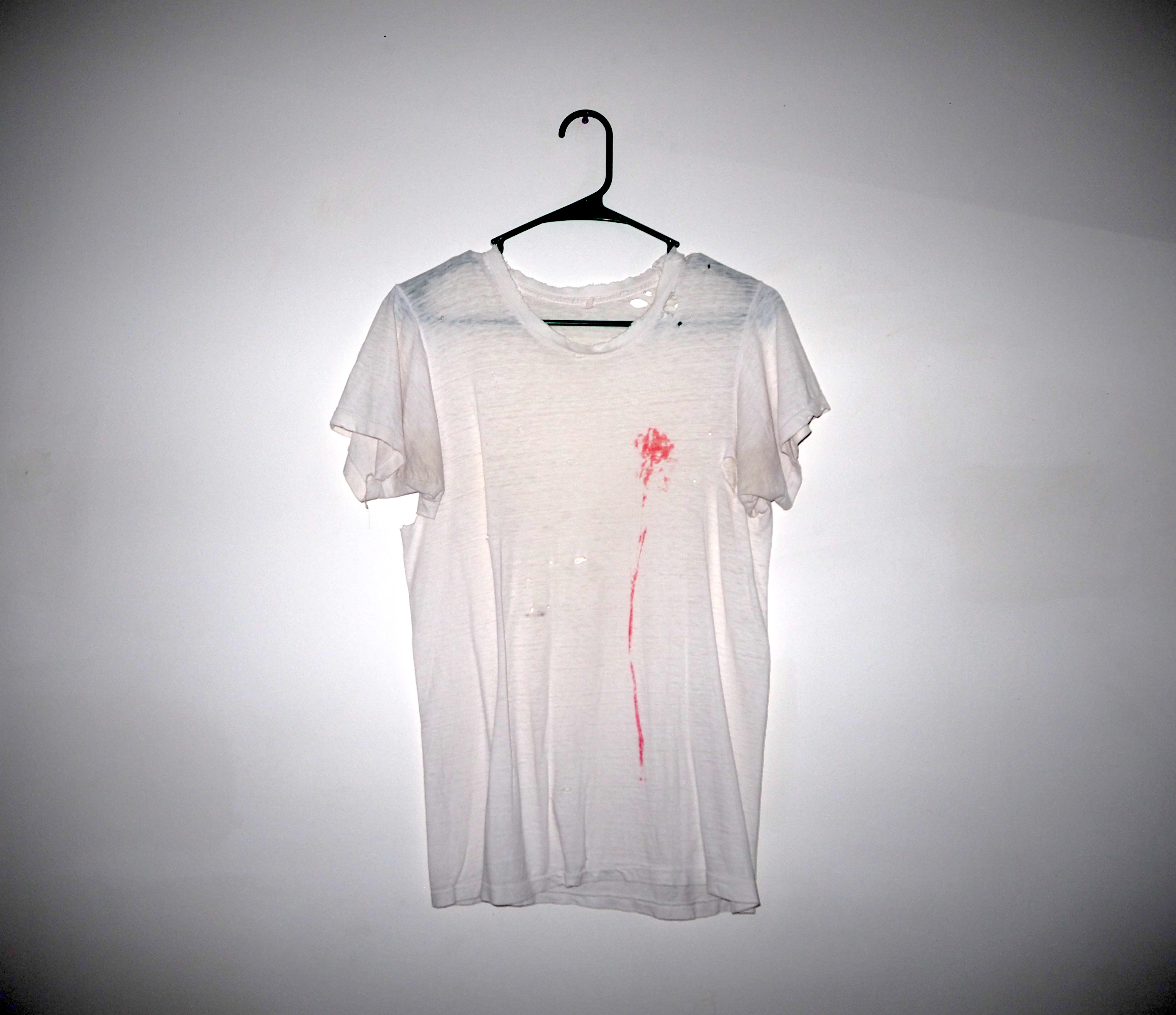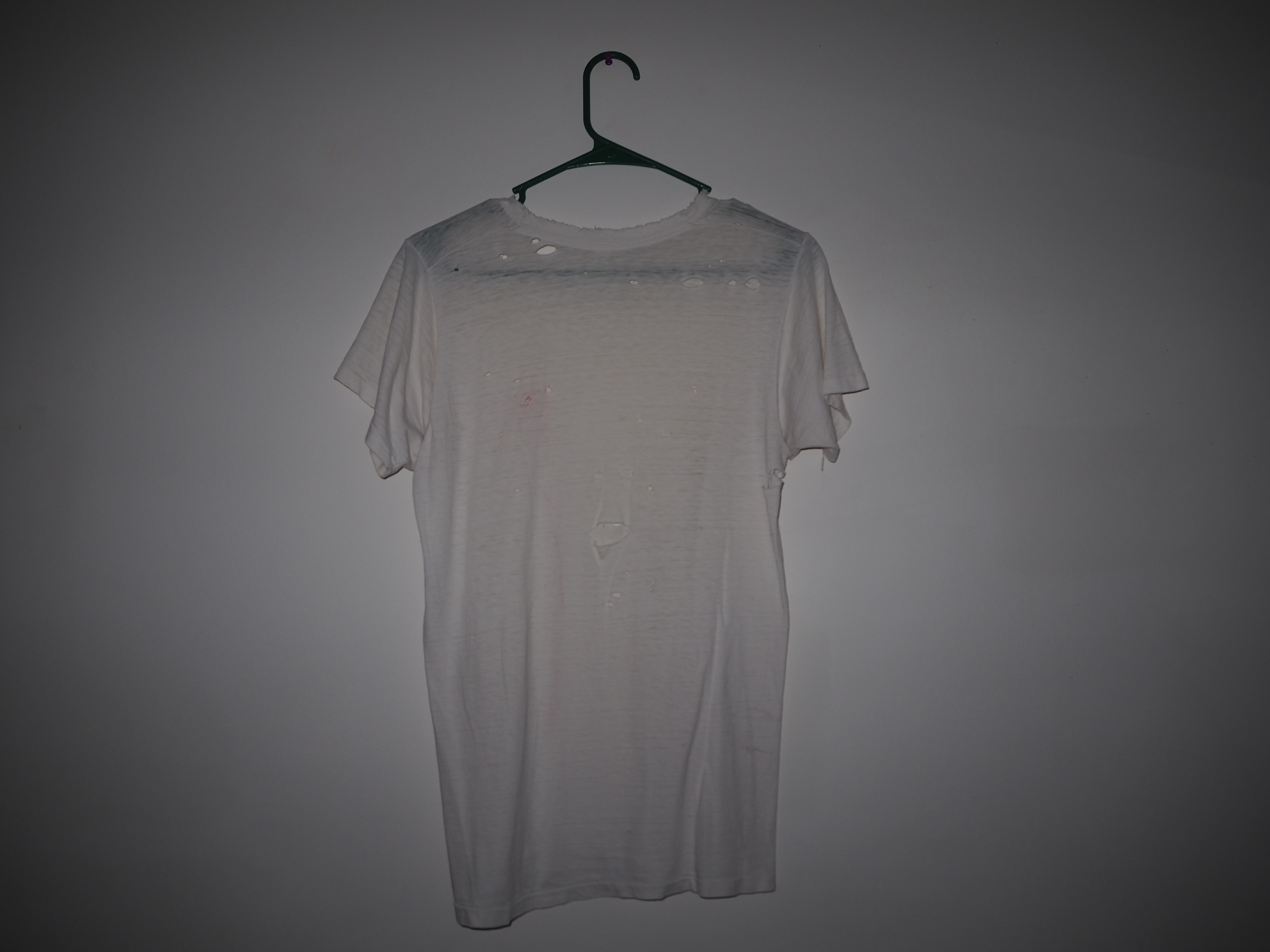 Dead Rose t-shirt. Made on a thrashed vintage white tee. Ripped armpits and holes throughout. Paper thin. It’s beautiful. It’s Arbol. I rolled red ink on a dead rose and hand pressed it onto the shirt. Fits small - medium.