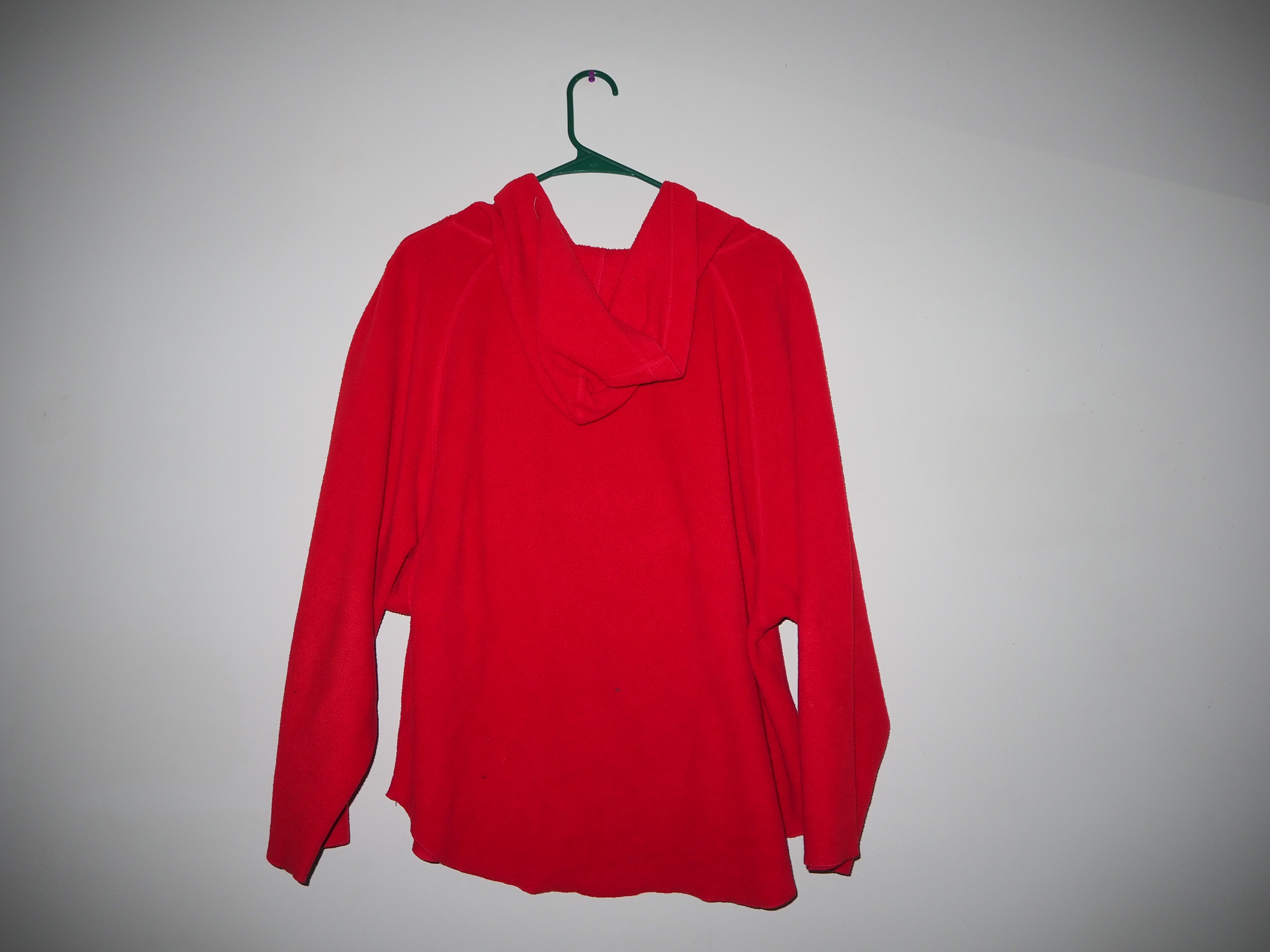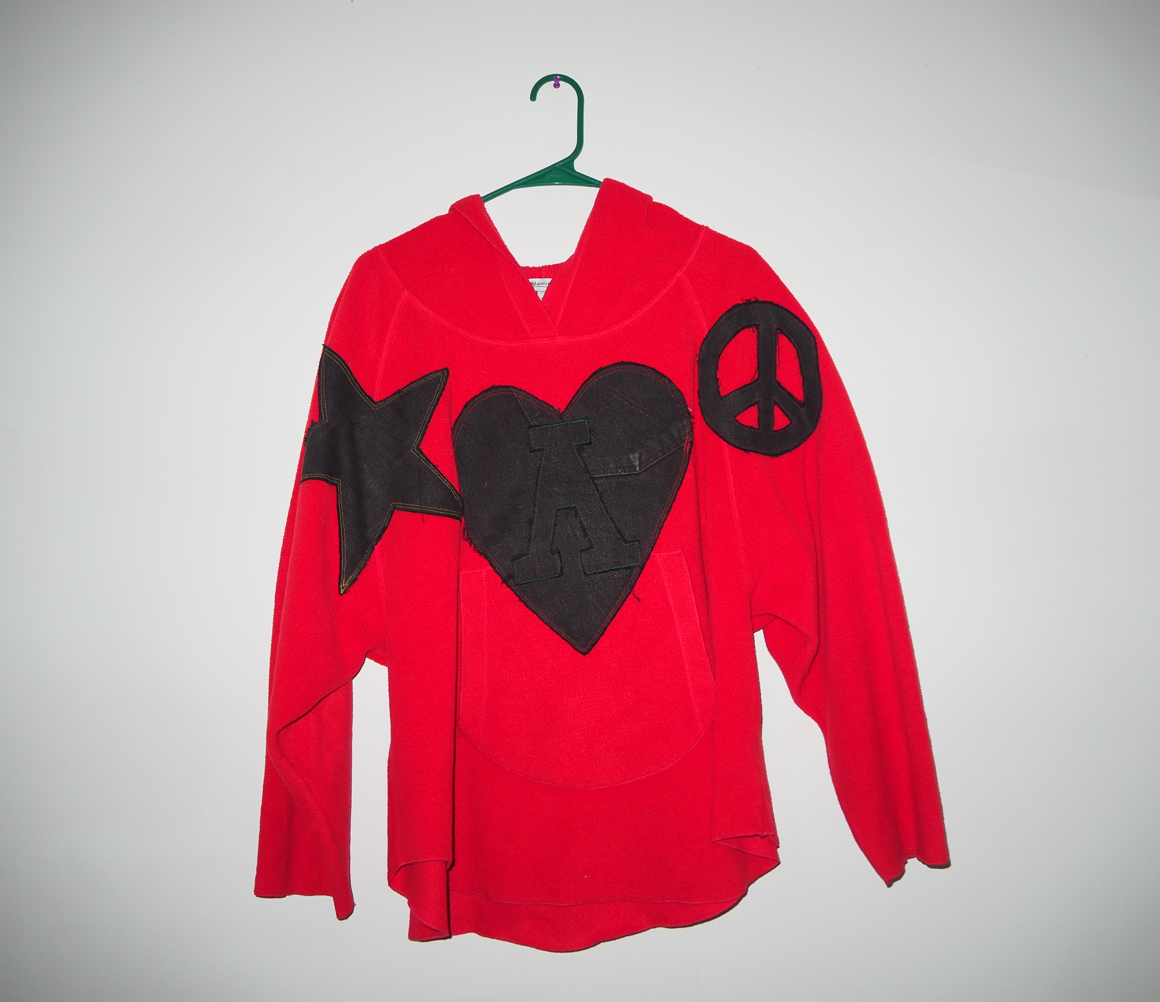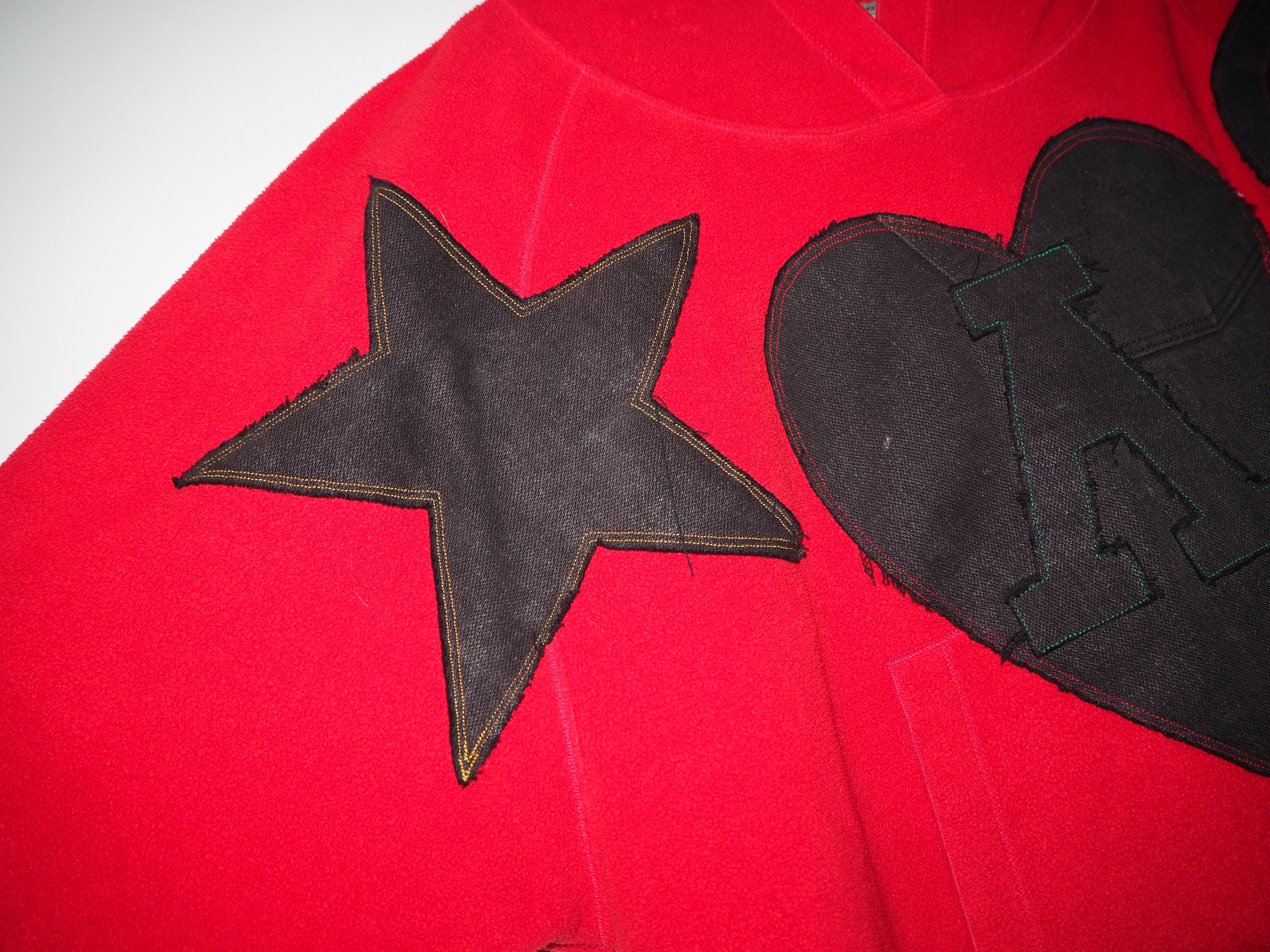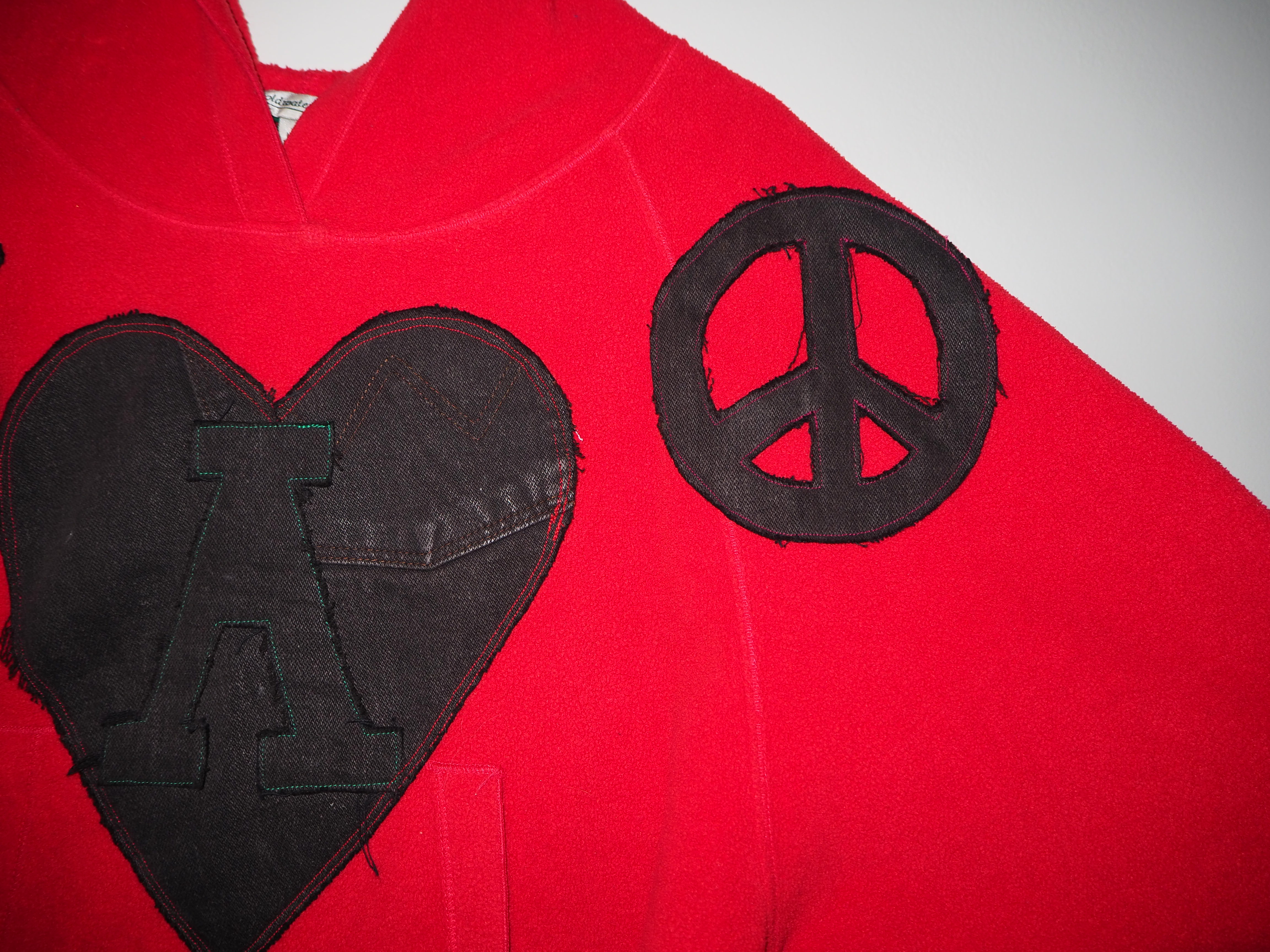 Grandma’s Pullover. Made on a red fleece pullover. Featuring black denim applique shapes. A heart, star, and peace sign. I think this is a womens X-Large and it has a rounded bottom hem.