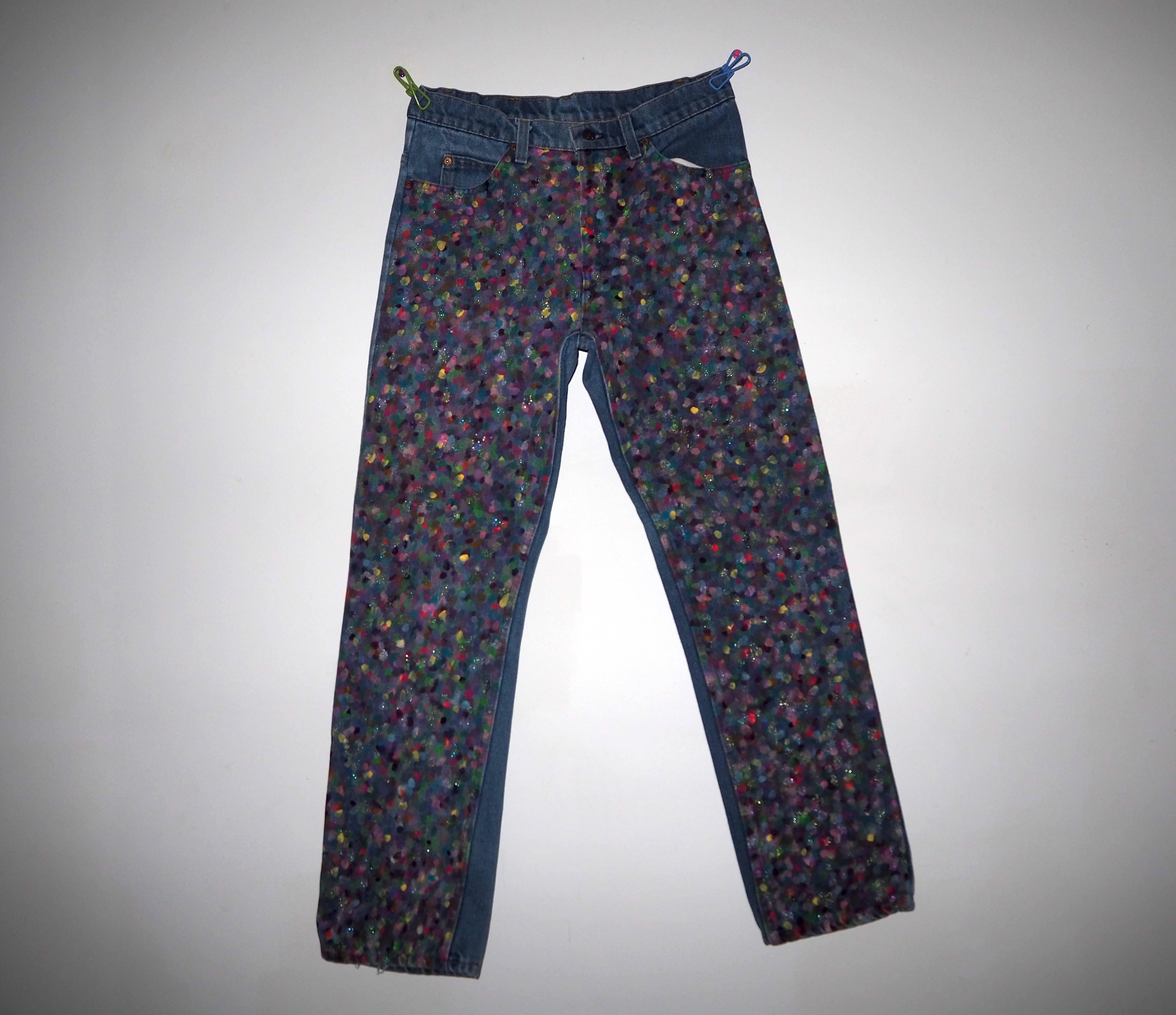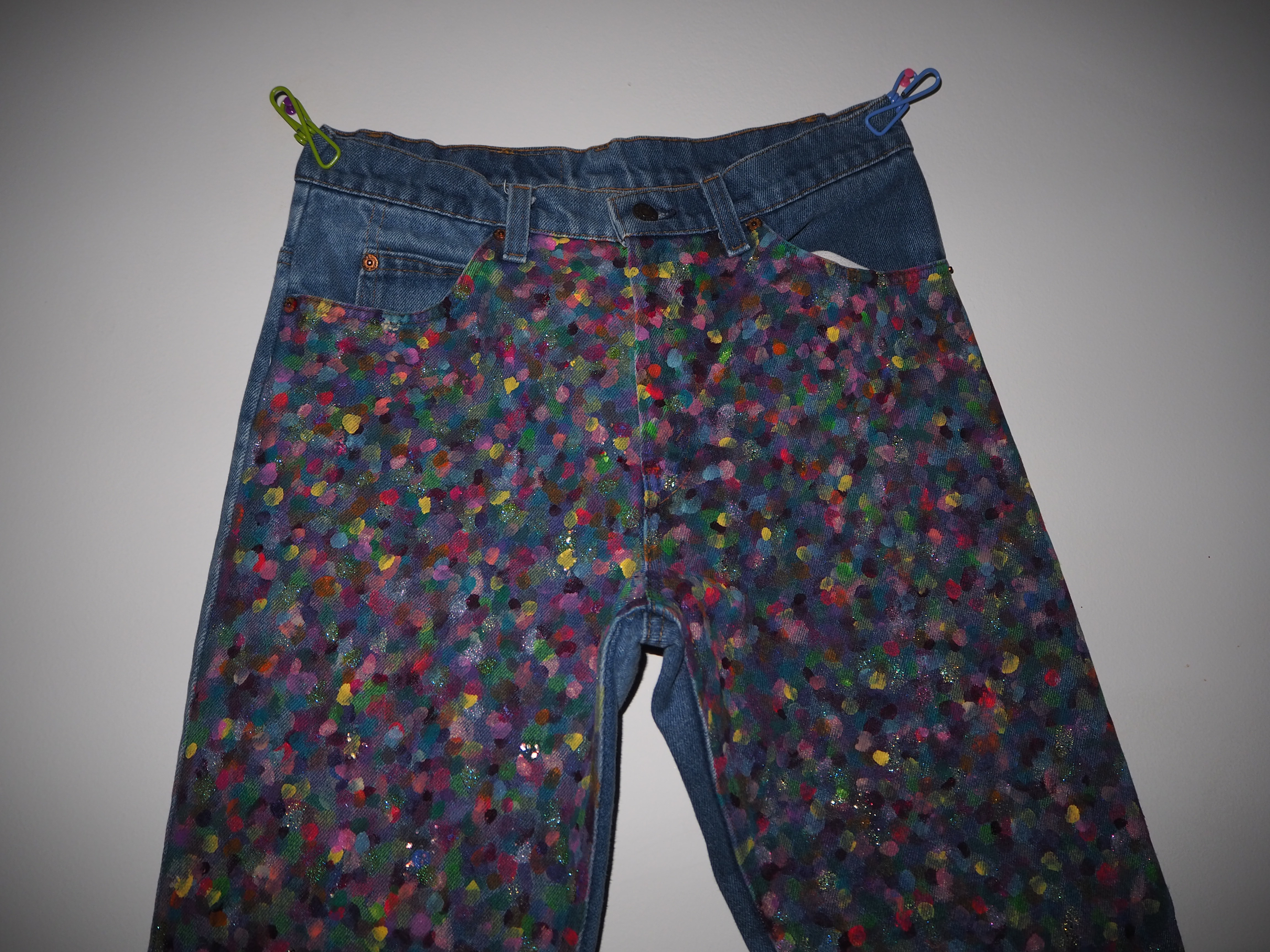 Hannah Montana or the children’s book with the rainbow fish. I made these with over 30 colors of nail polish slowly layering up over time. adding single dots one by one. I got a massive headache and the house smelled like a nail salon. Fits 30 x 30. Made on orange tab Levi’s. They have ink stains on the back pocket.