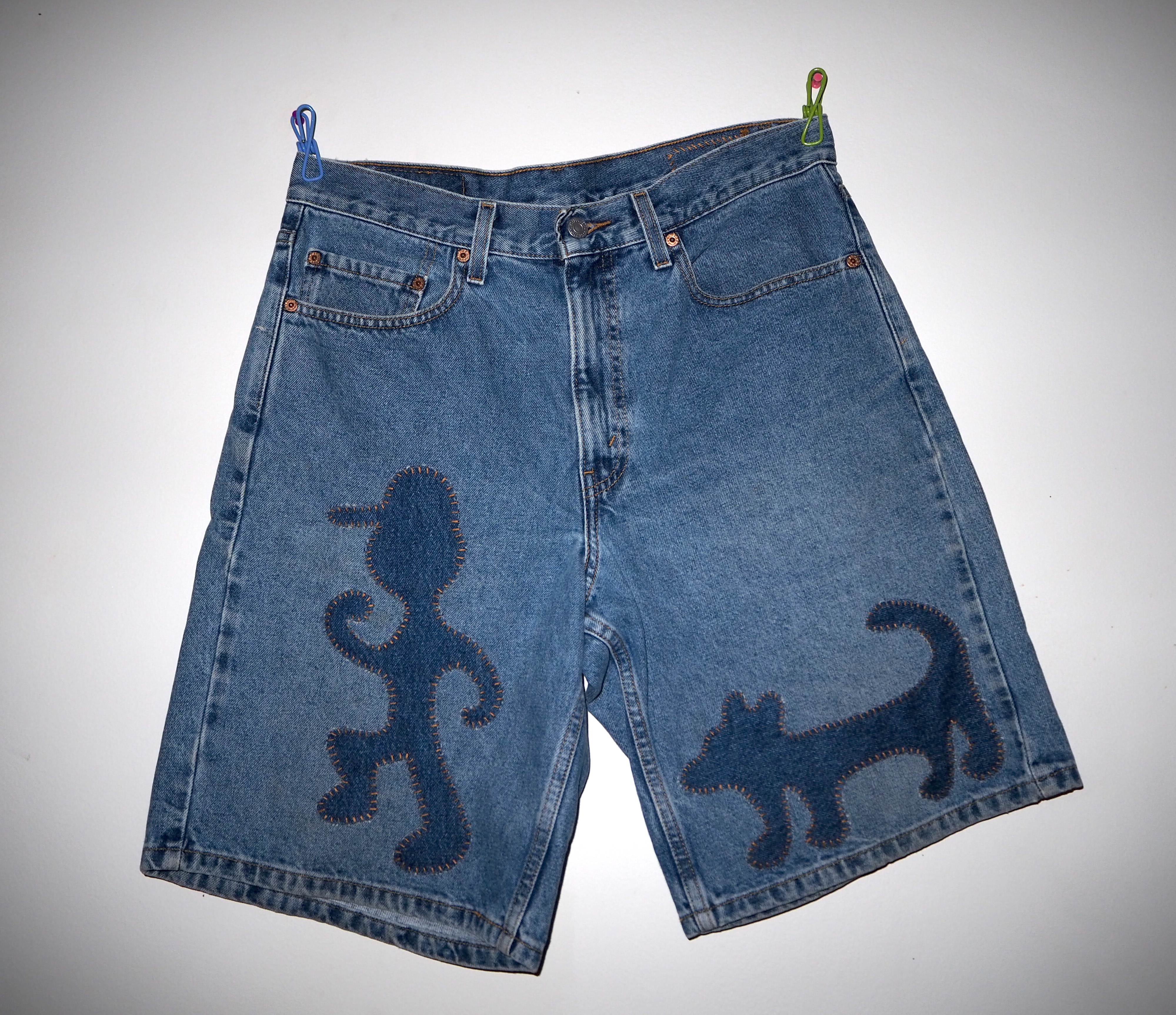 Jo and Tiny shorts. It’s me and my family chihuahua Tiny Tim. Hand drawn and sewn shapes. Denim on denim as always. These are old Levi’s and fit 33” waist.