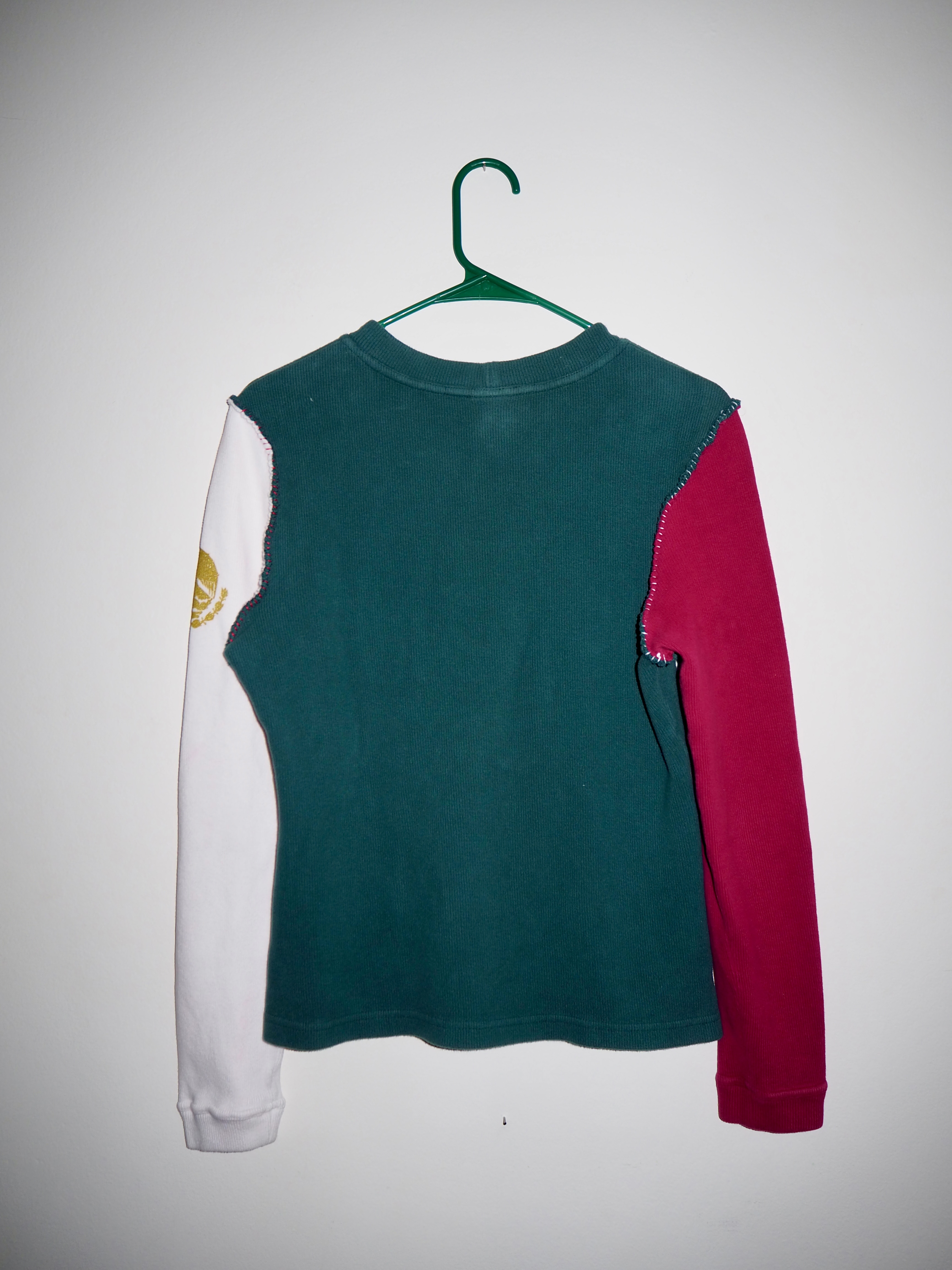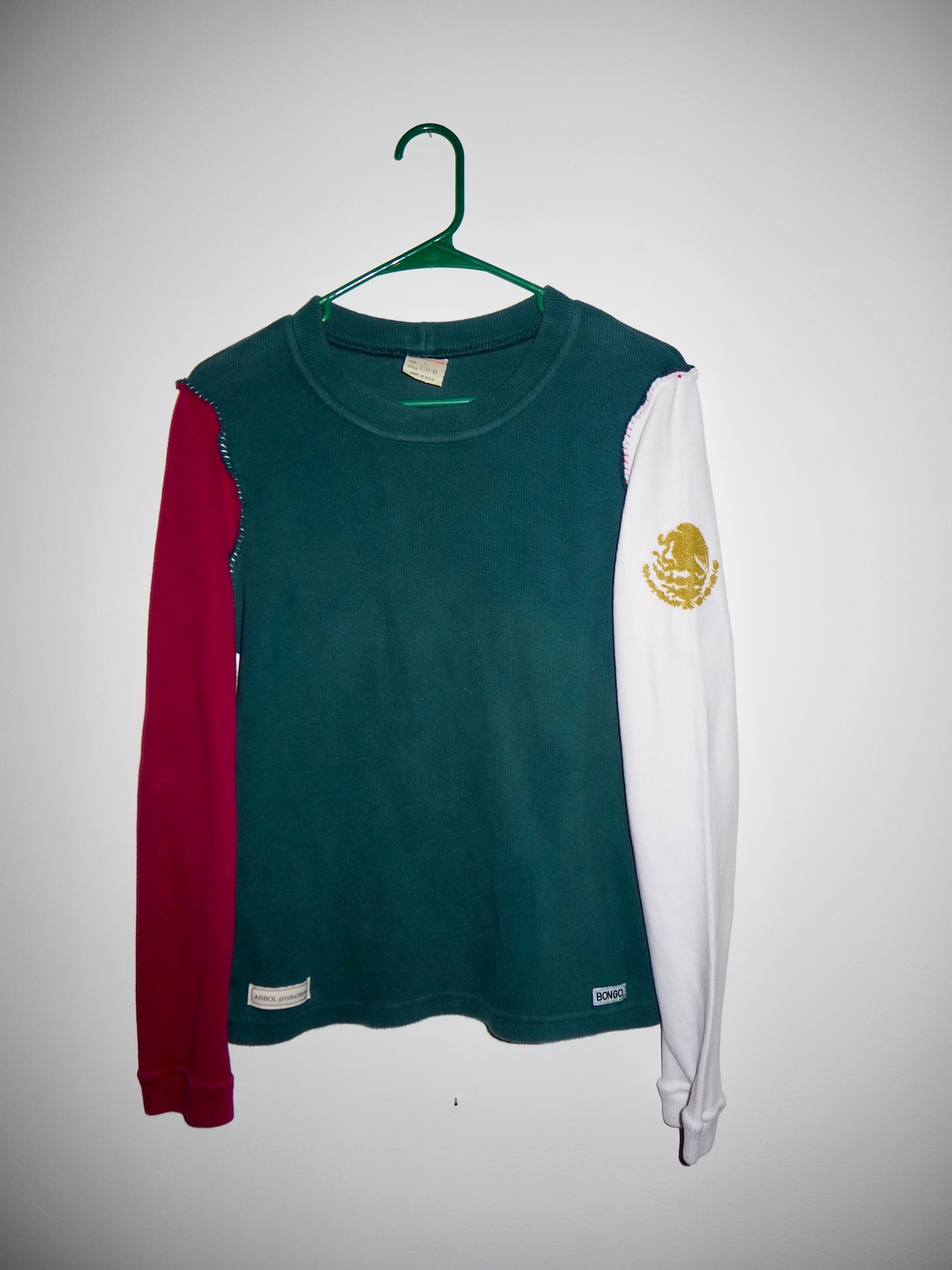 Made from vintage Bongo Jeans thermals. White and Red sleeves with a Green chest. Gold glitter screen printed mexico flag design on the left sleeve. Hand stitched sleeves with seams on the outside and a contrast color stitching. This is a piece of ARBOL history.