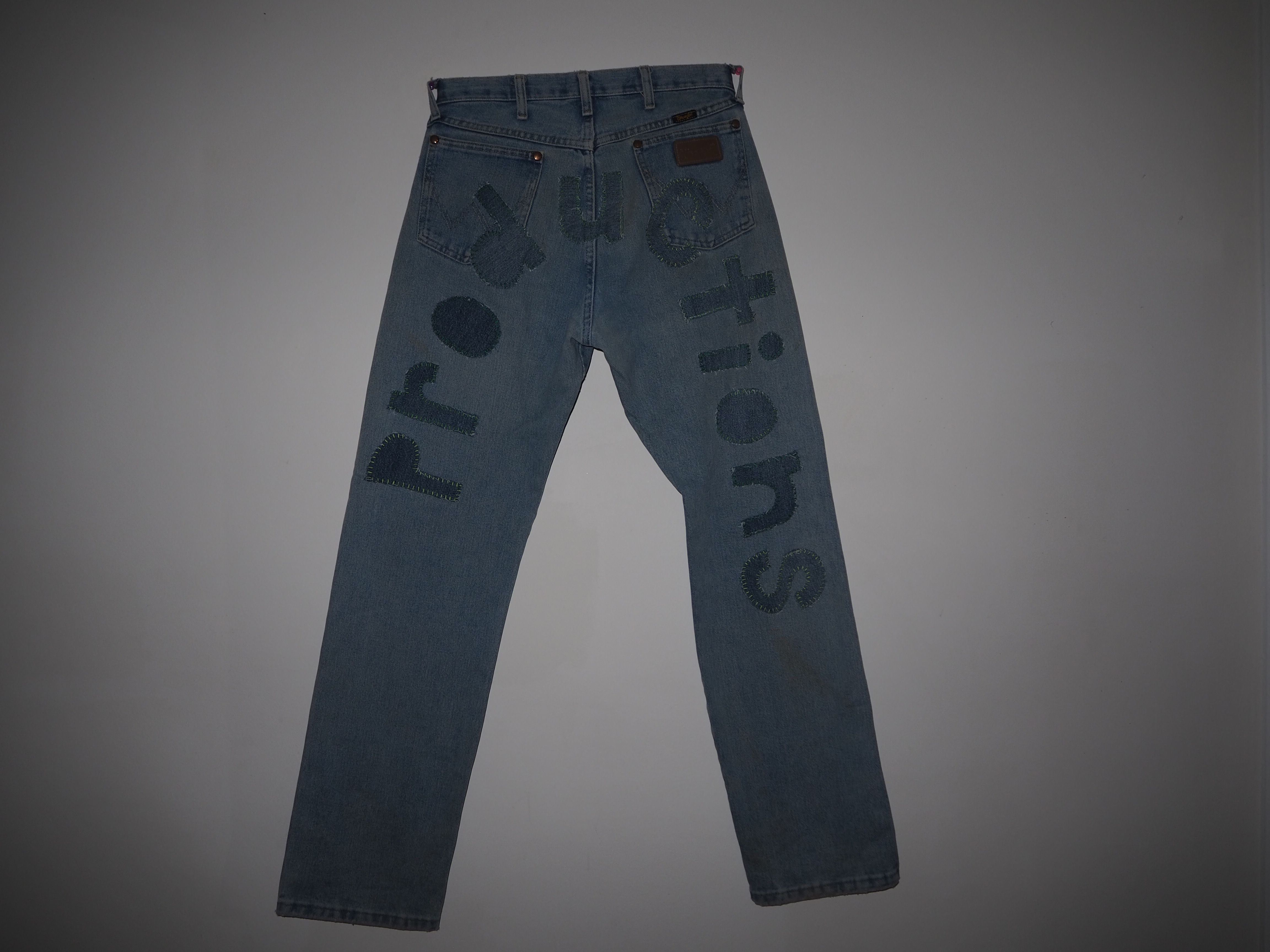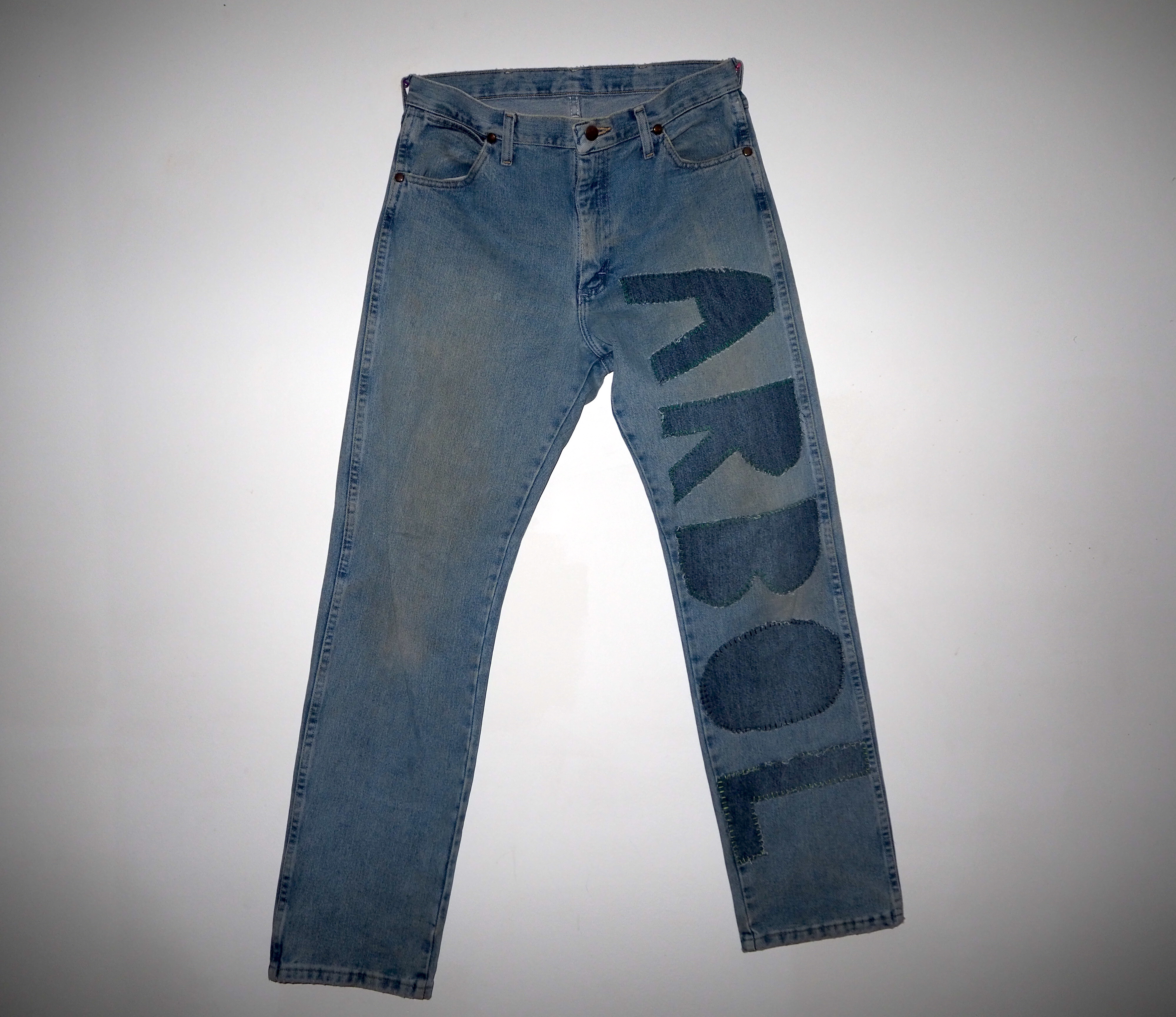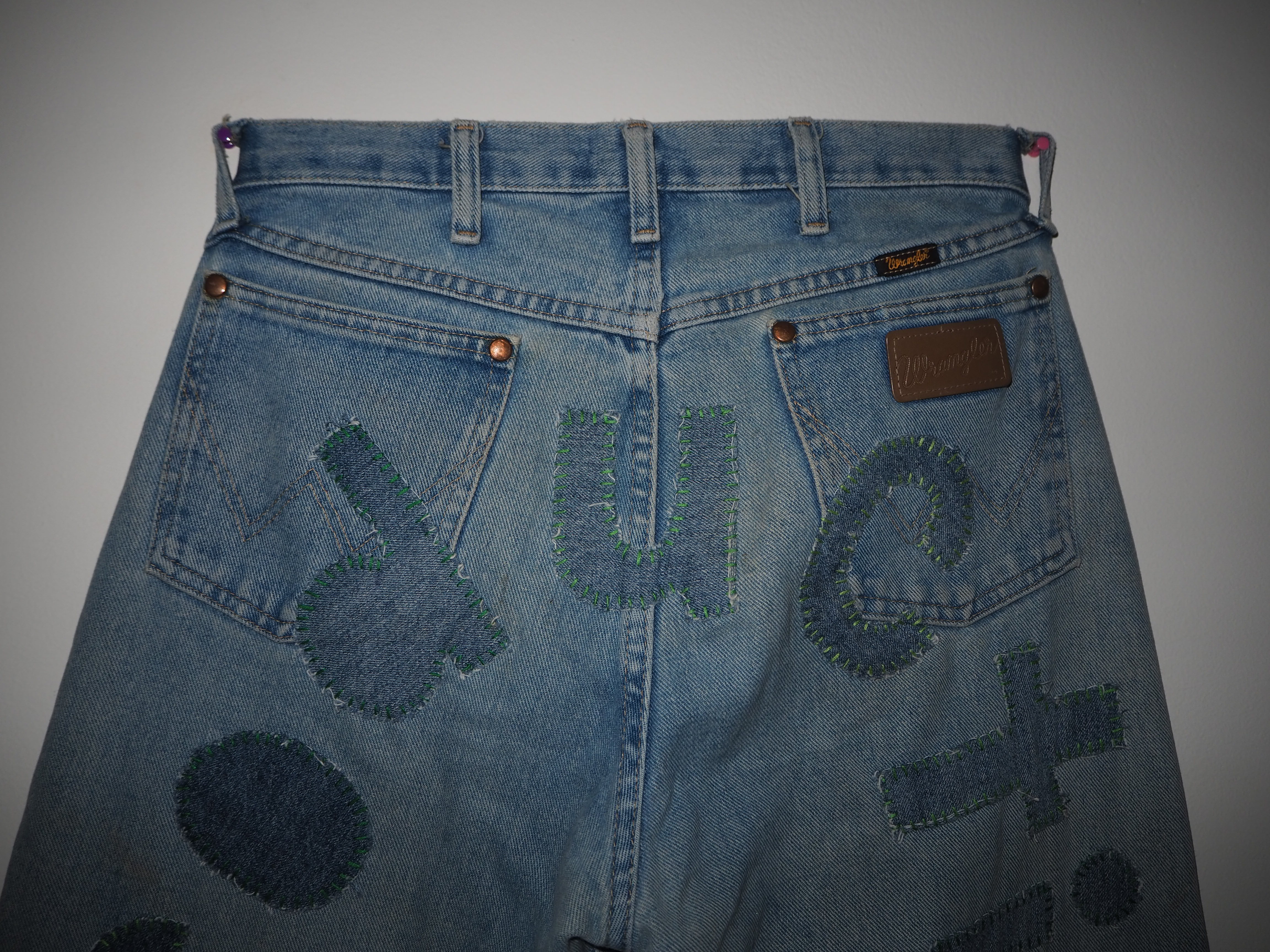 Mr. ARBOL productions. ARBOL on the front, productions on the back. All hand sewn shapes. Denim on denim fr. The arbol way. Made on old wrangler’s. Fits 32 x 30.