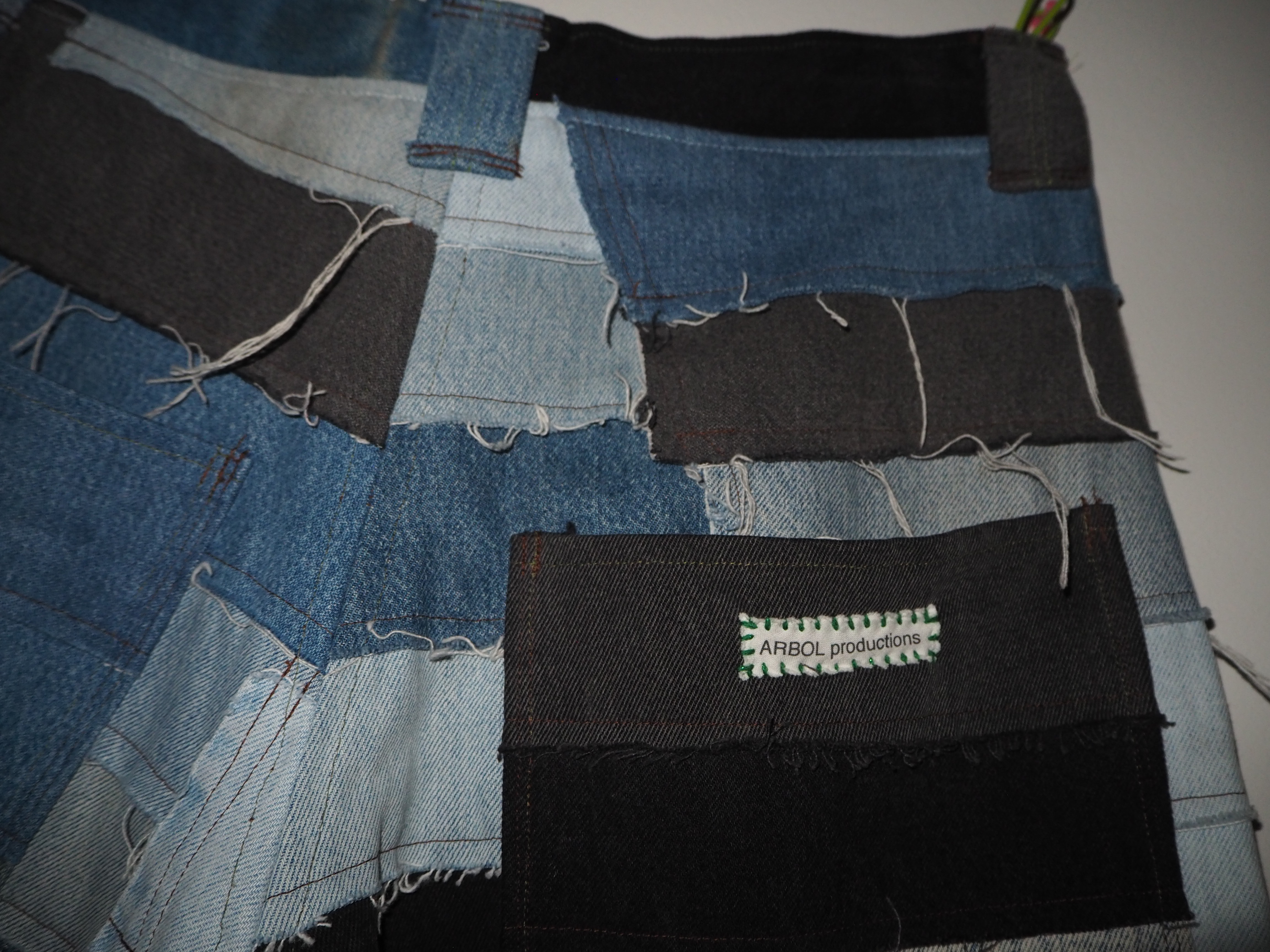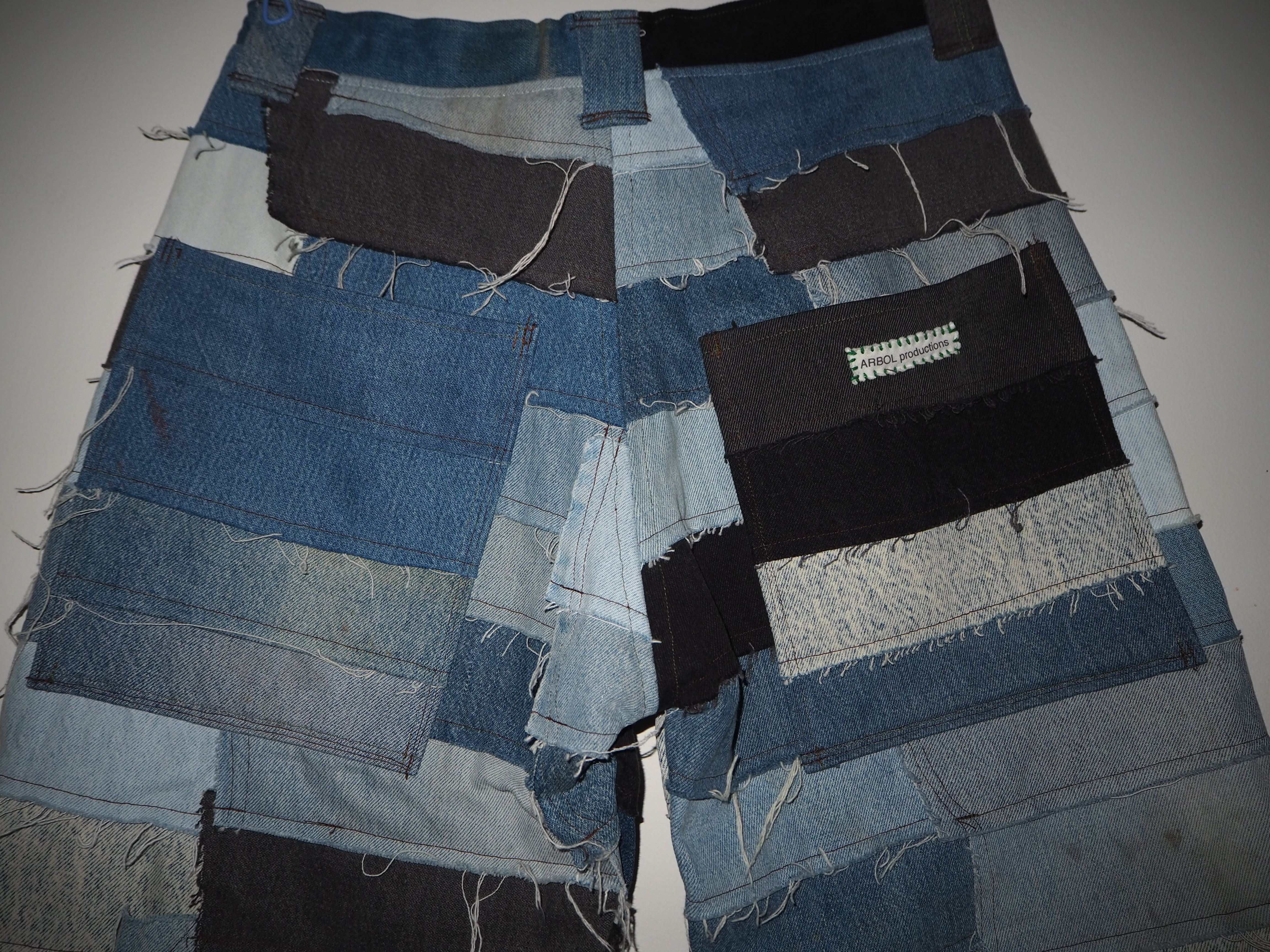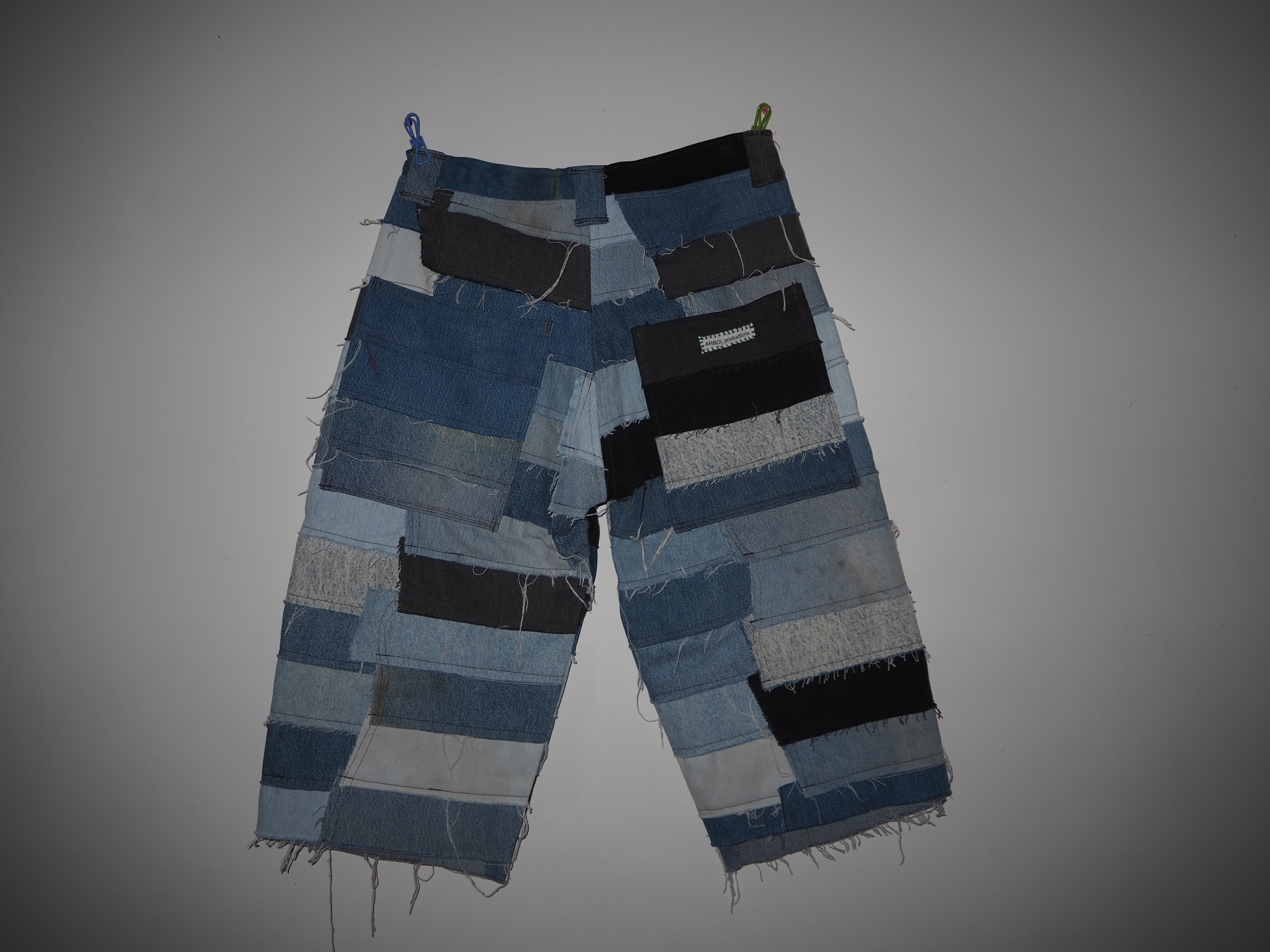 Shingle Culottes. Completely cut and sewn. I made the fabric from denim scraps. Really really baggy shorts. They have an elastic waistband and only 2 back pockets. Some of the denim is stained. The fabric will fray over time. Fits 33” waist and has belt loops.