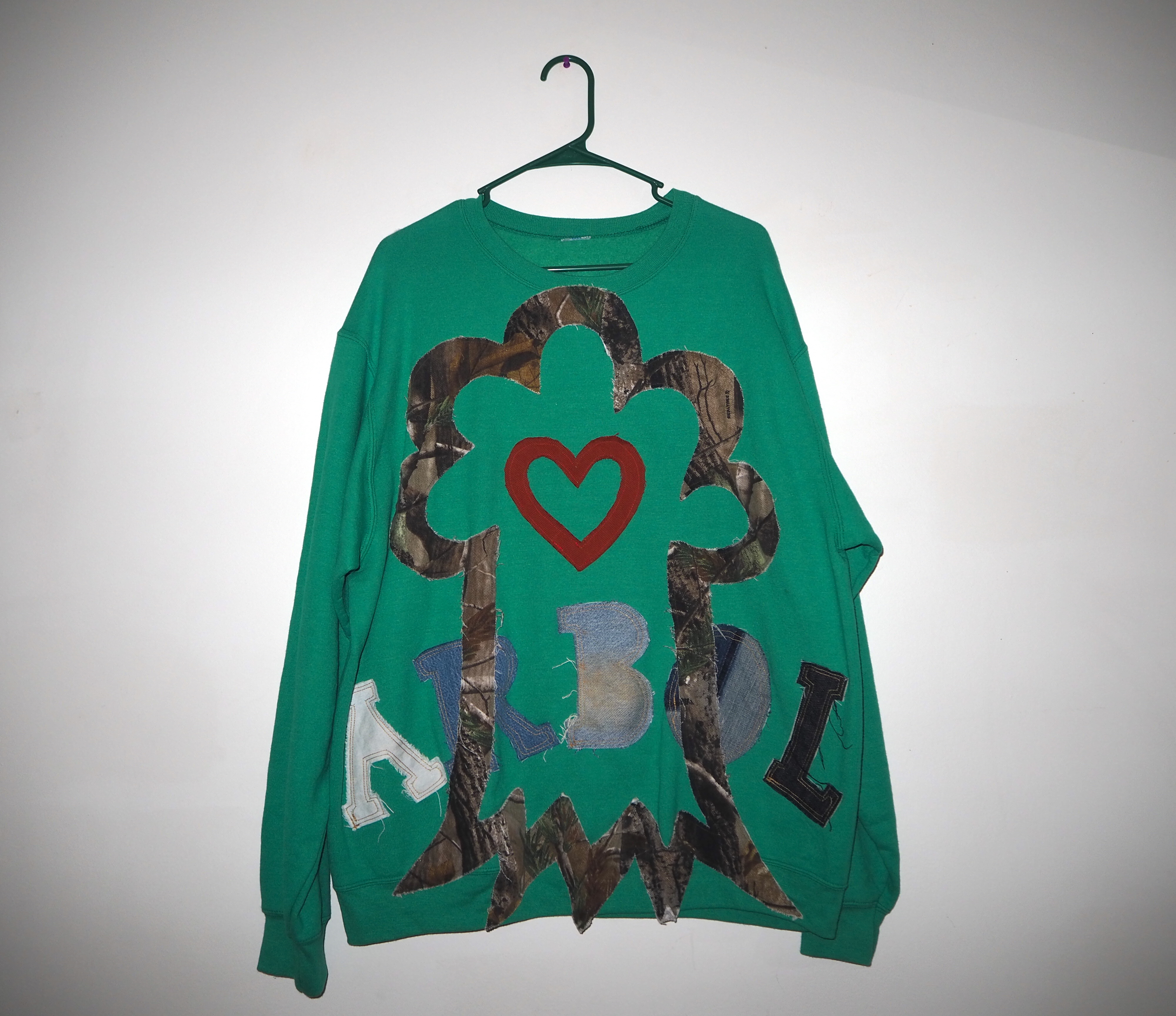 Tree Love Crewneck. Made on a Green sweater. Featuring ARBOL spellout on the stomach, an oversized camo tree, and a red heart. All denim applique. Fits Large.