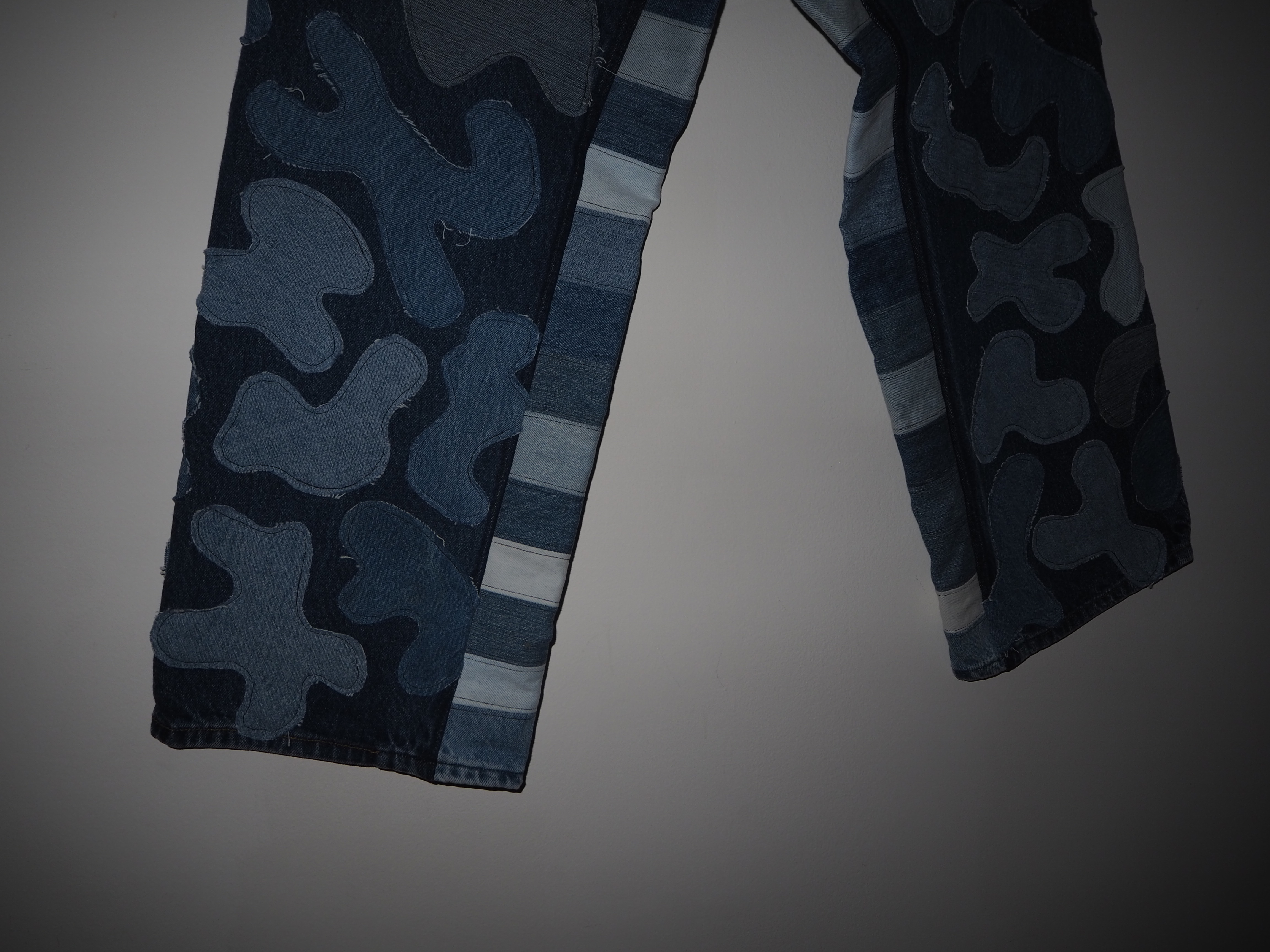 Underwater Adventure. Multi colored denim for the organic shapes and the stripes. I made them baggier with striped denim on the inseam. Fits 32 x 30.