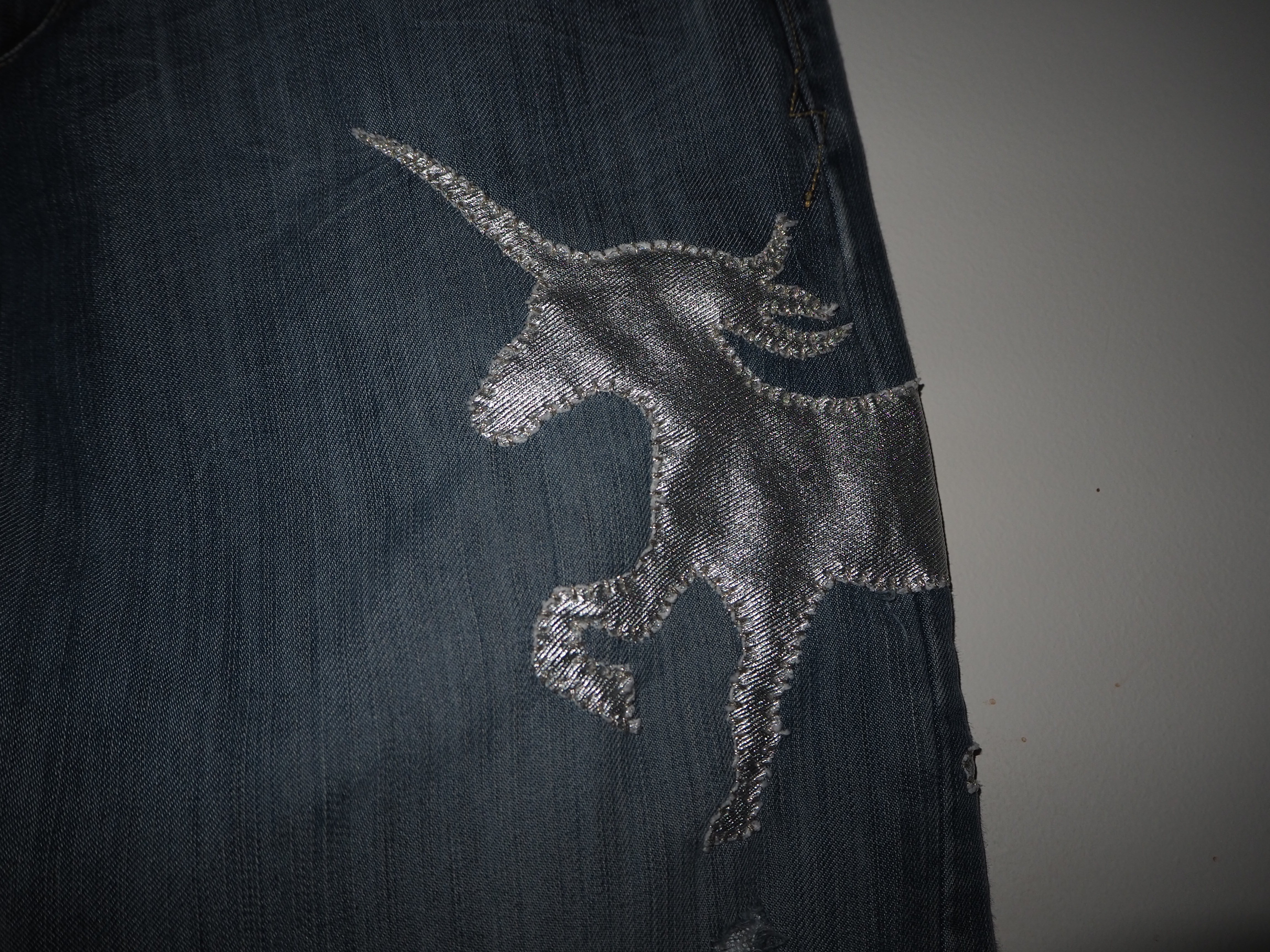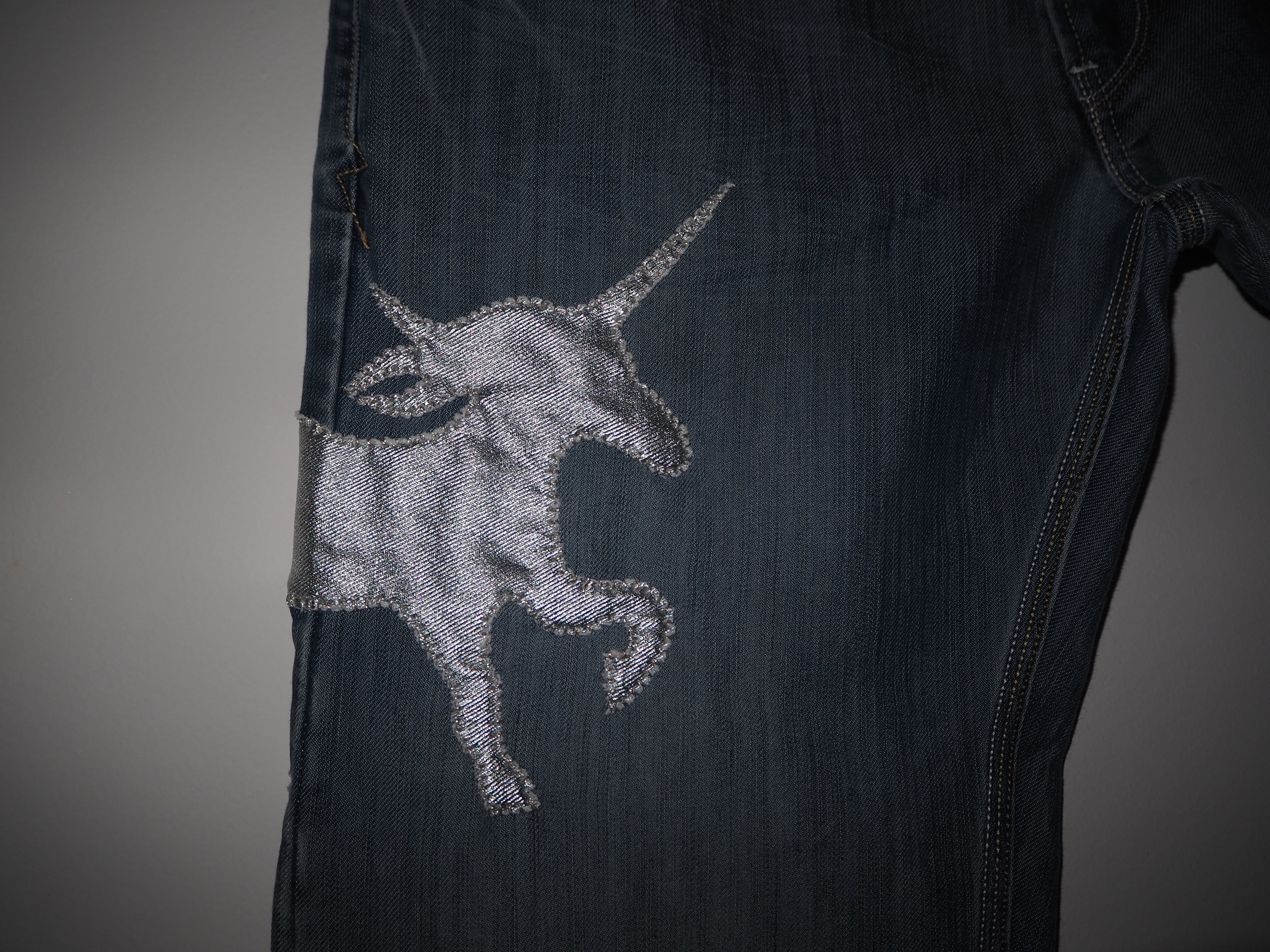 Unicorn Jeans. They are twins. Imagine strutting around in these bad boys. Metallic denim material for the shapes. Hand drawn and hand sewn on retro Levi’s. They have a bootcut fit and distressing throughout. Major heel bite and a hole on the left knee area. Fit 33 x 32.