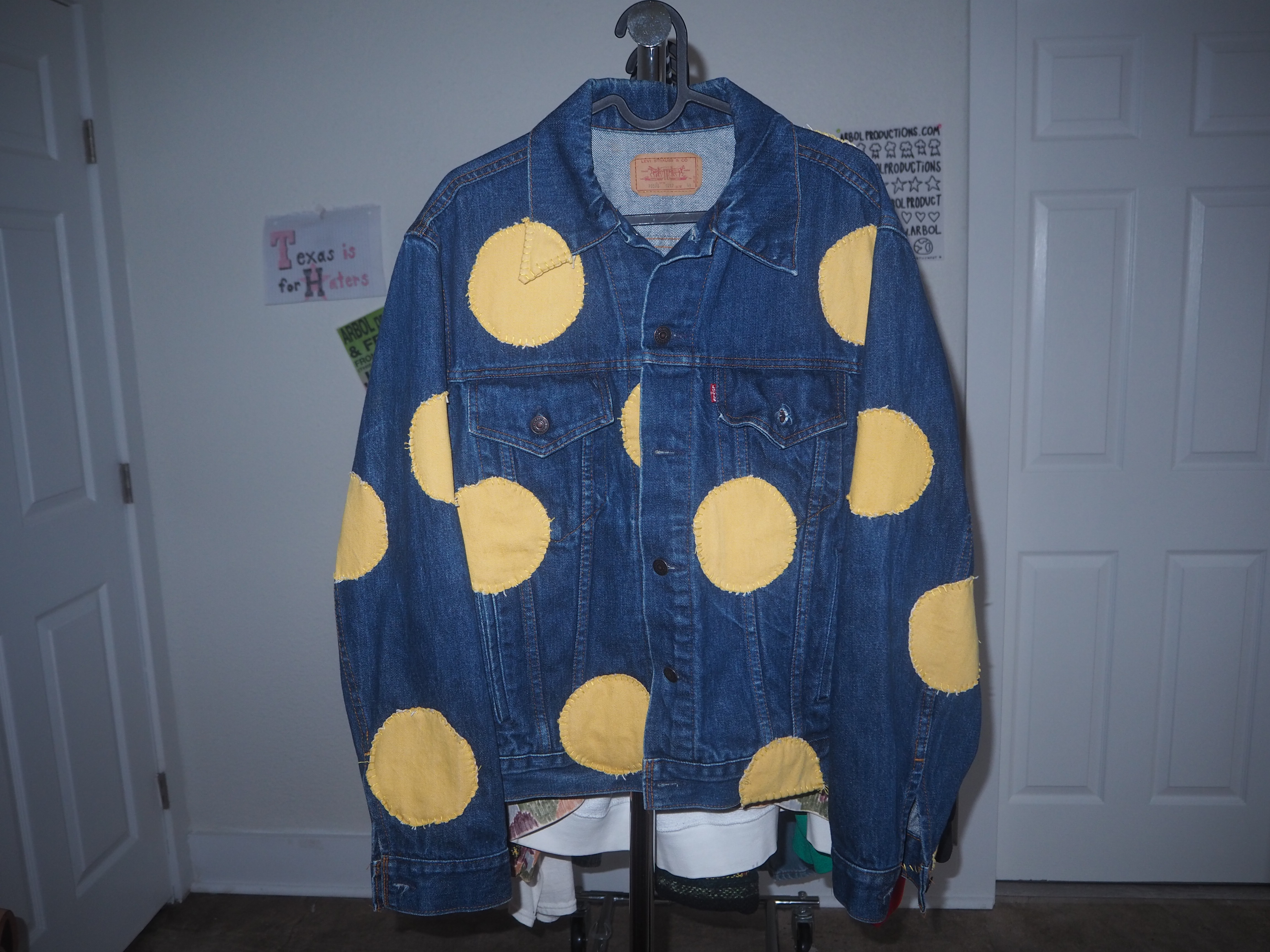 Hand cut and sewn denim circles which used to be a pair of yellow 501’s