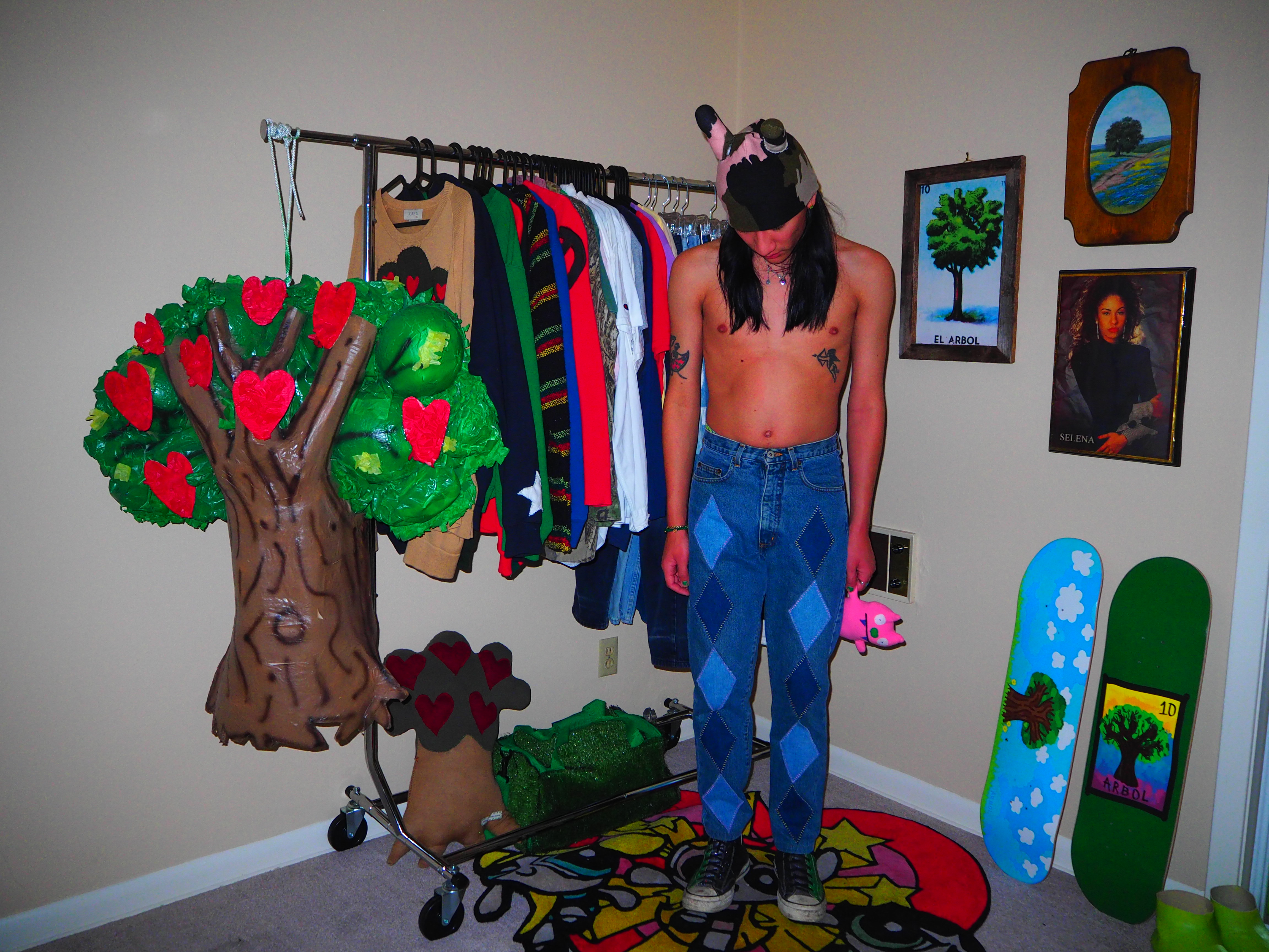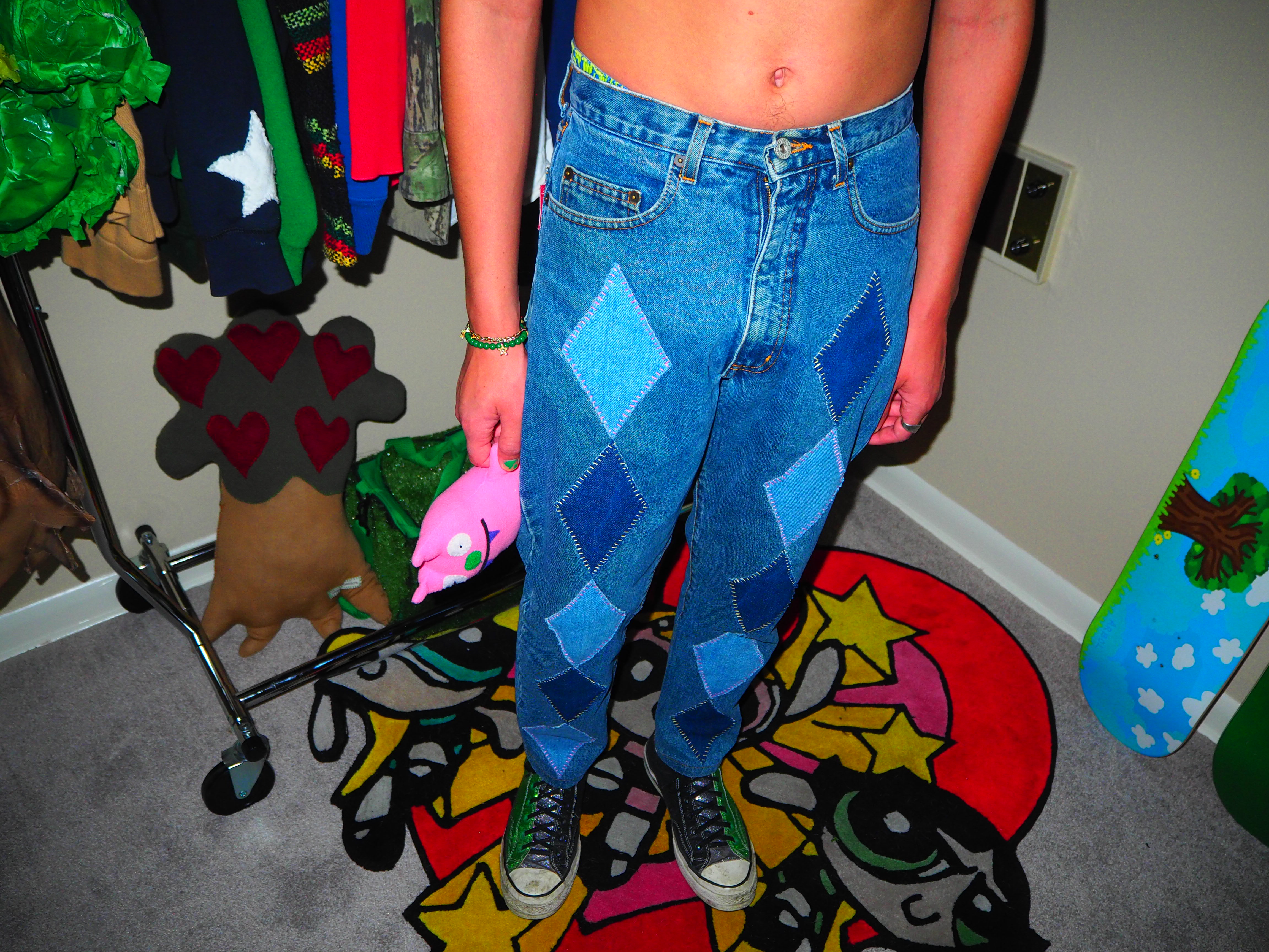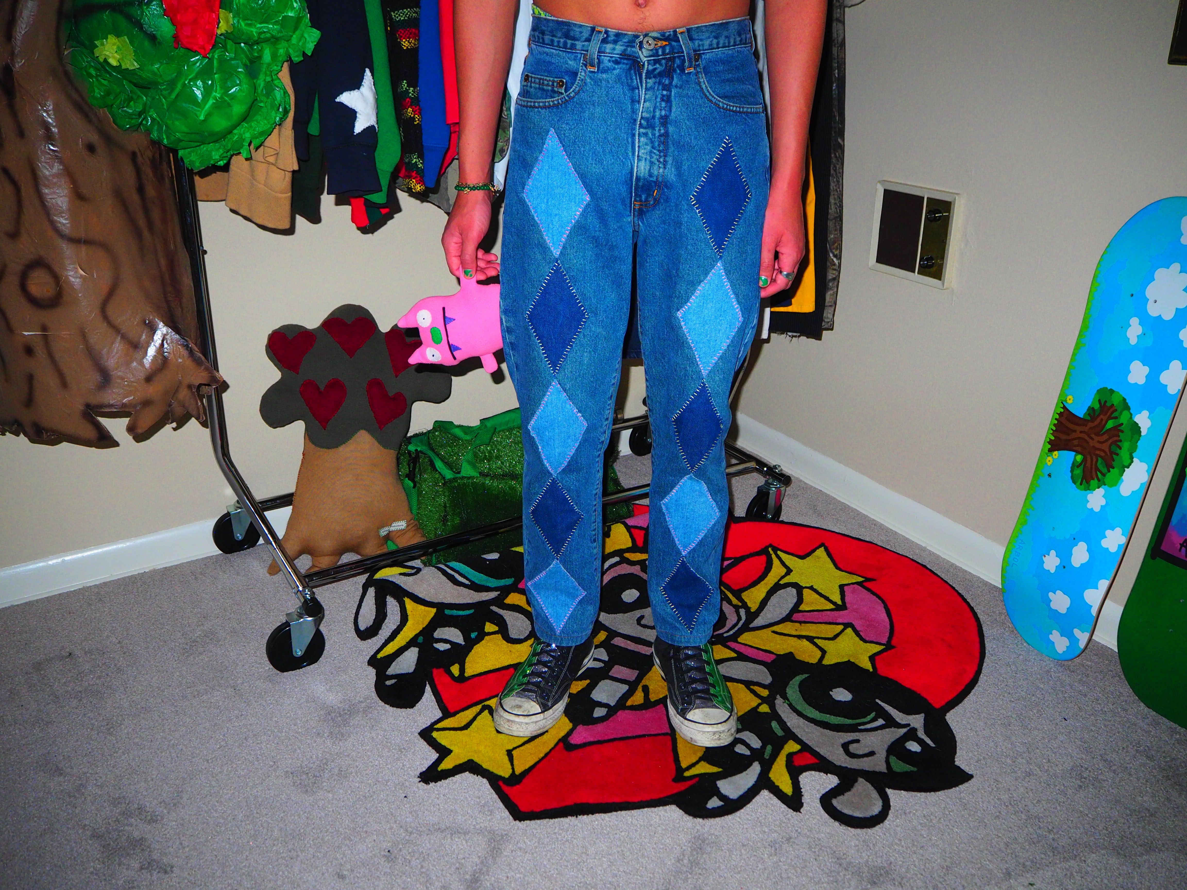 inspired by traditional american school wear. my take on a private school uniform. i never had to wear a uniform to school but if i did this would be it. featuring alternating color argyle in light and dark wash with pink and cream topstitch, additional argyle patch on back. on a pair of “for joseph” jeans. tagged 29 inch waist, fits best 28 inch waist.
