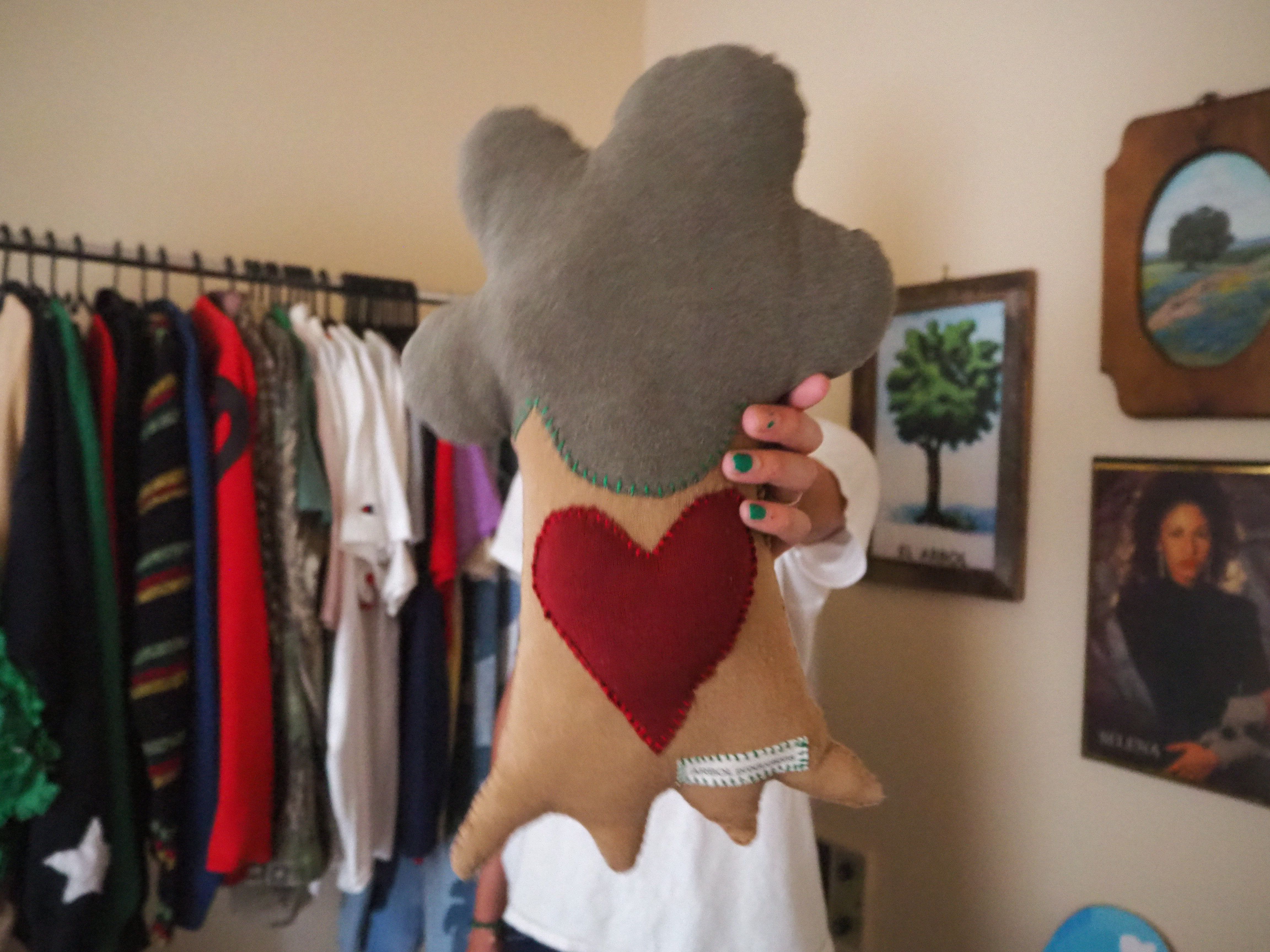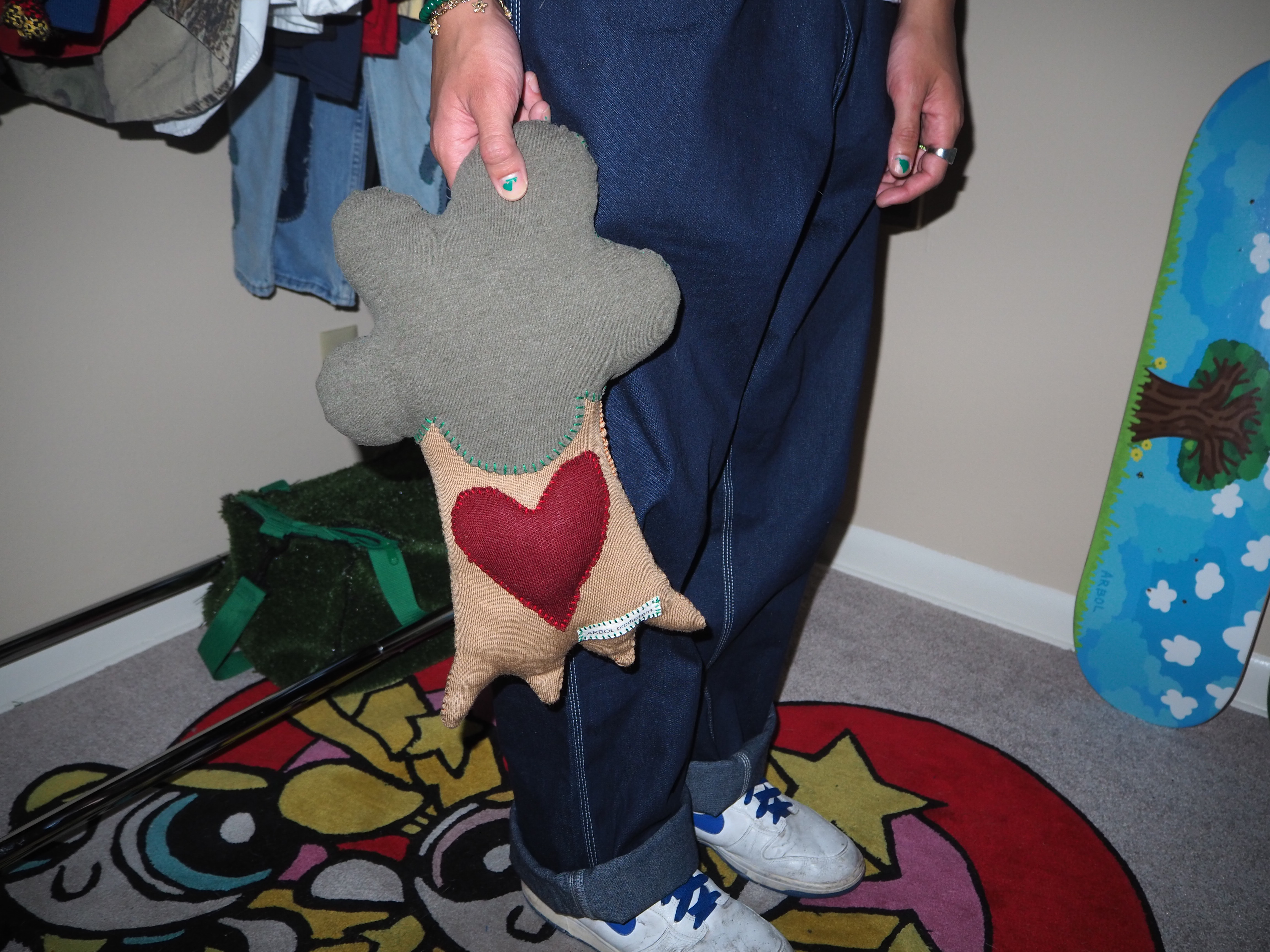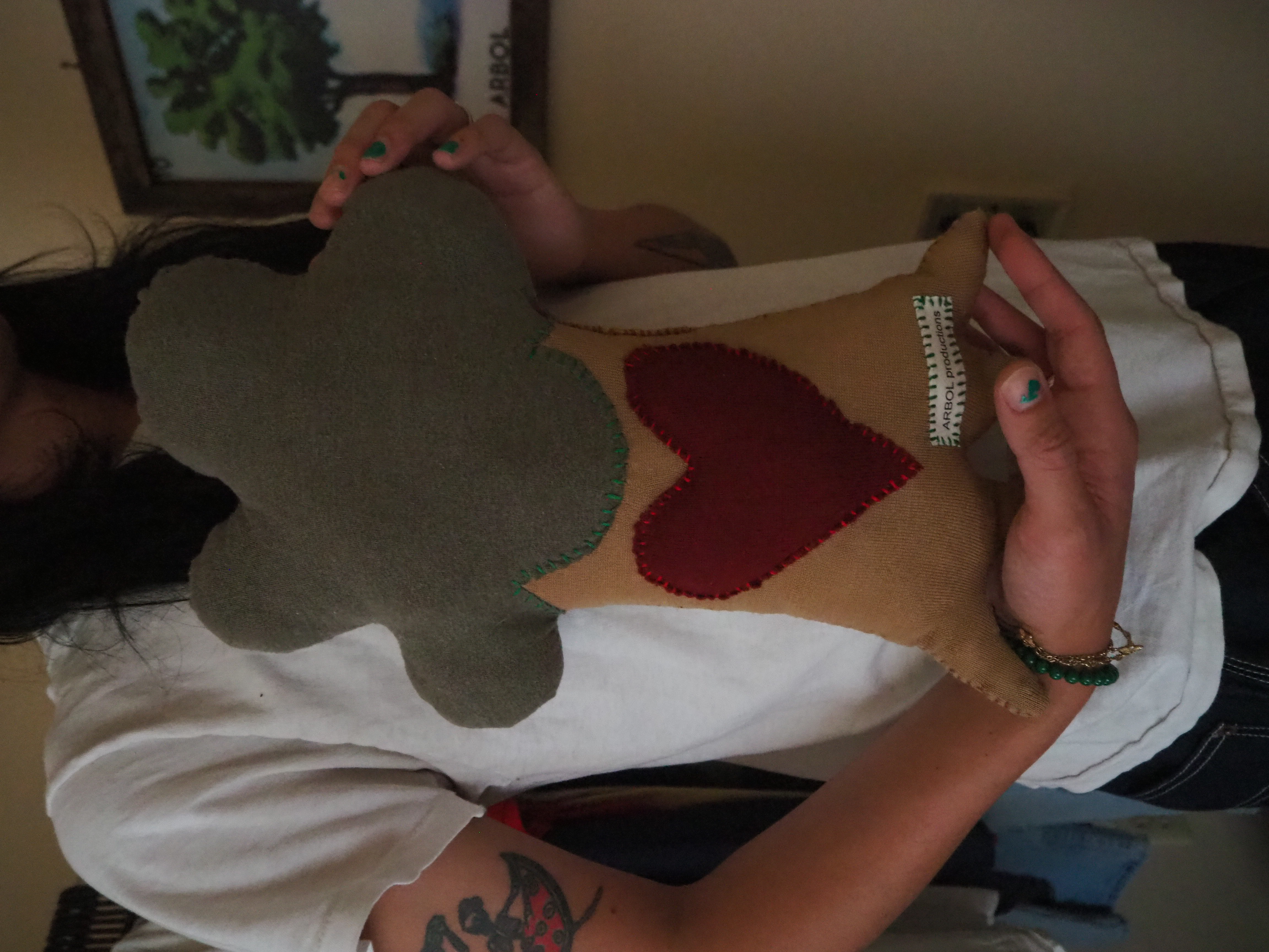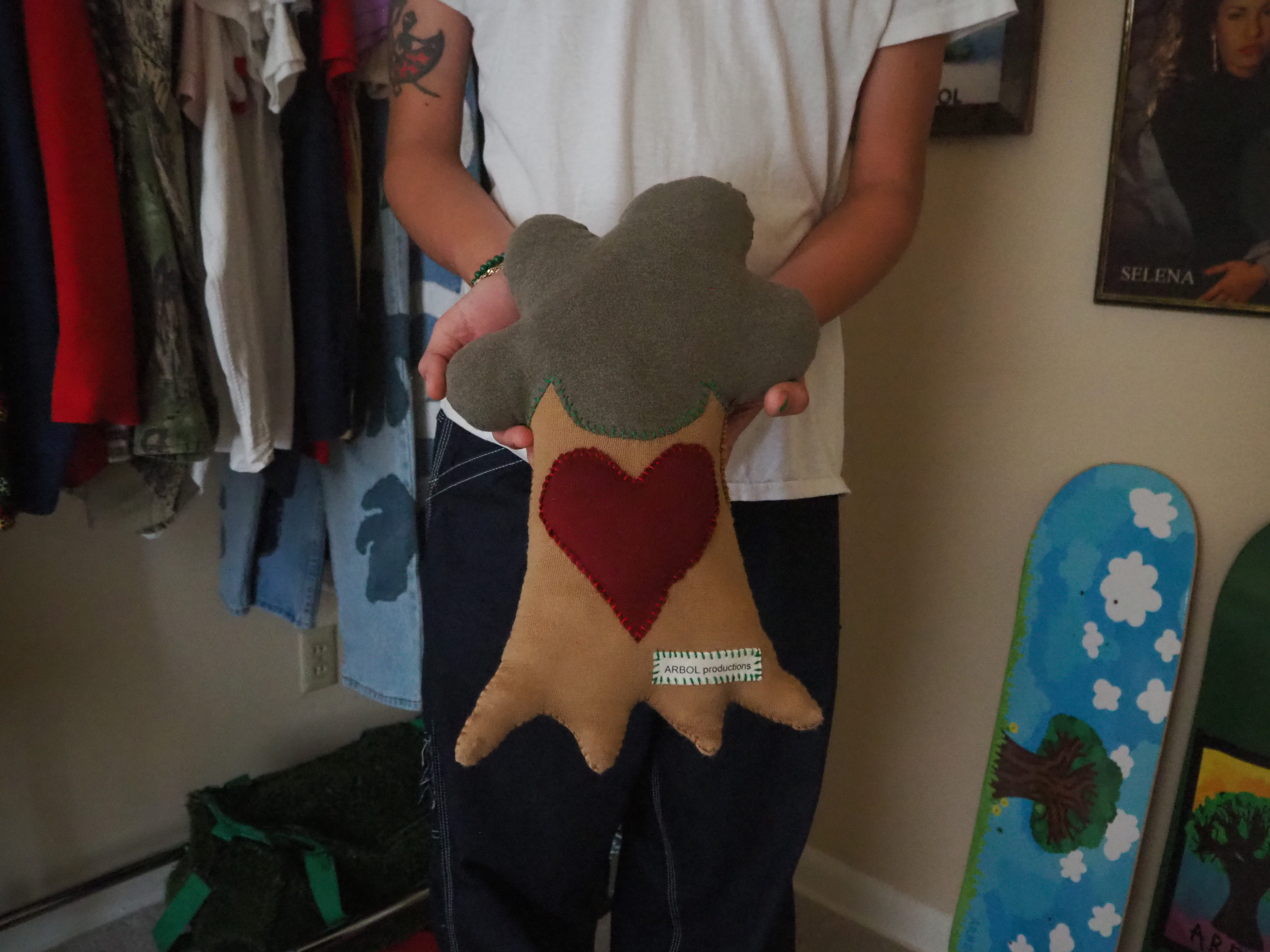 my second attempt at a plushie. a more handheld version of the big tree. heart on the trunk instead of the leaves. made from 100% recycled materials. 15” tall x 10” wide x 3” thick.
