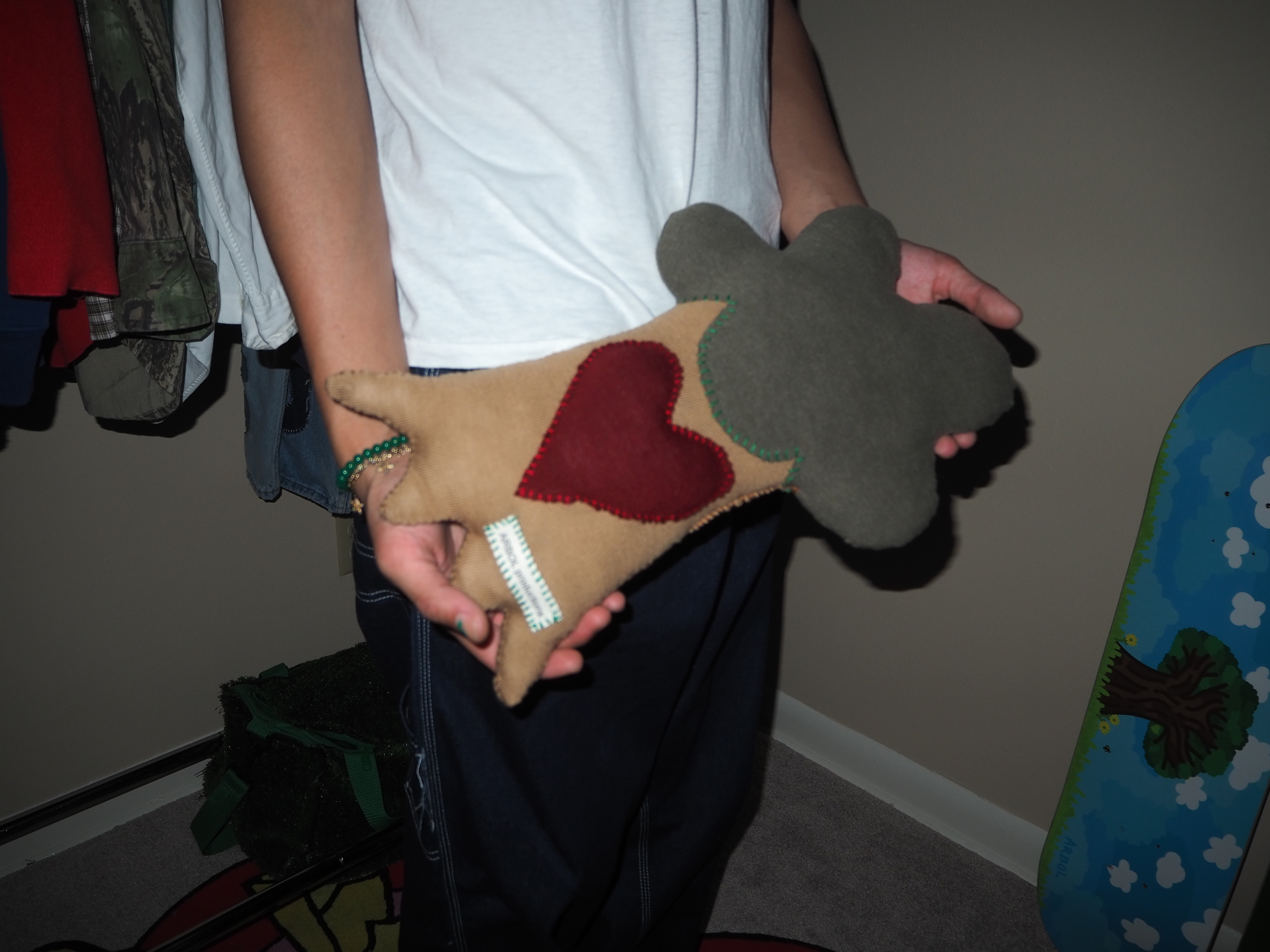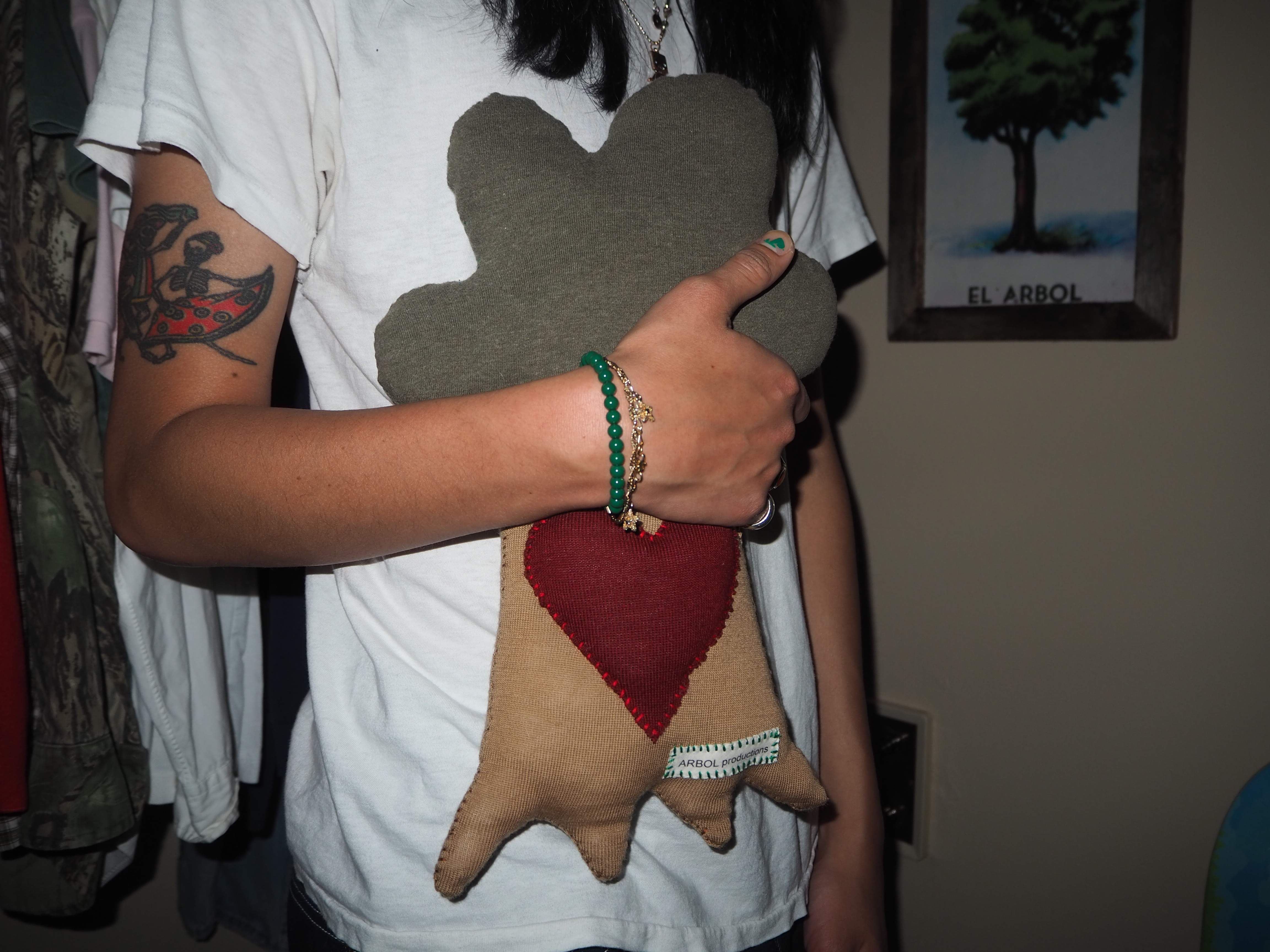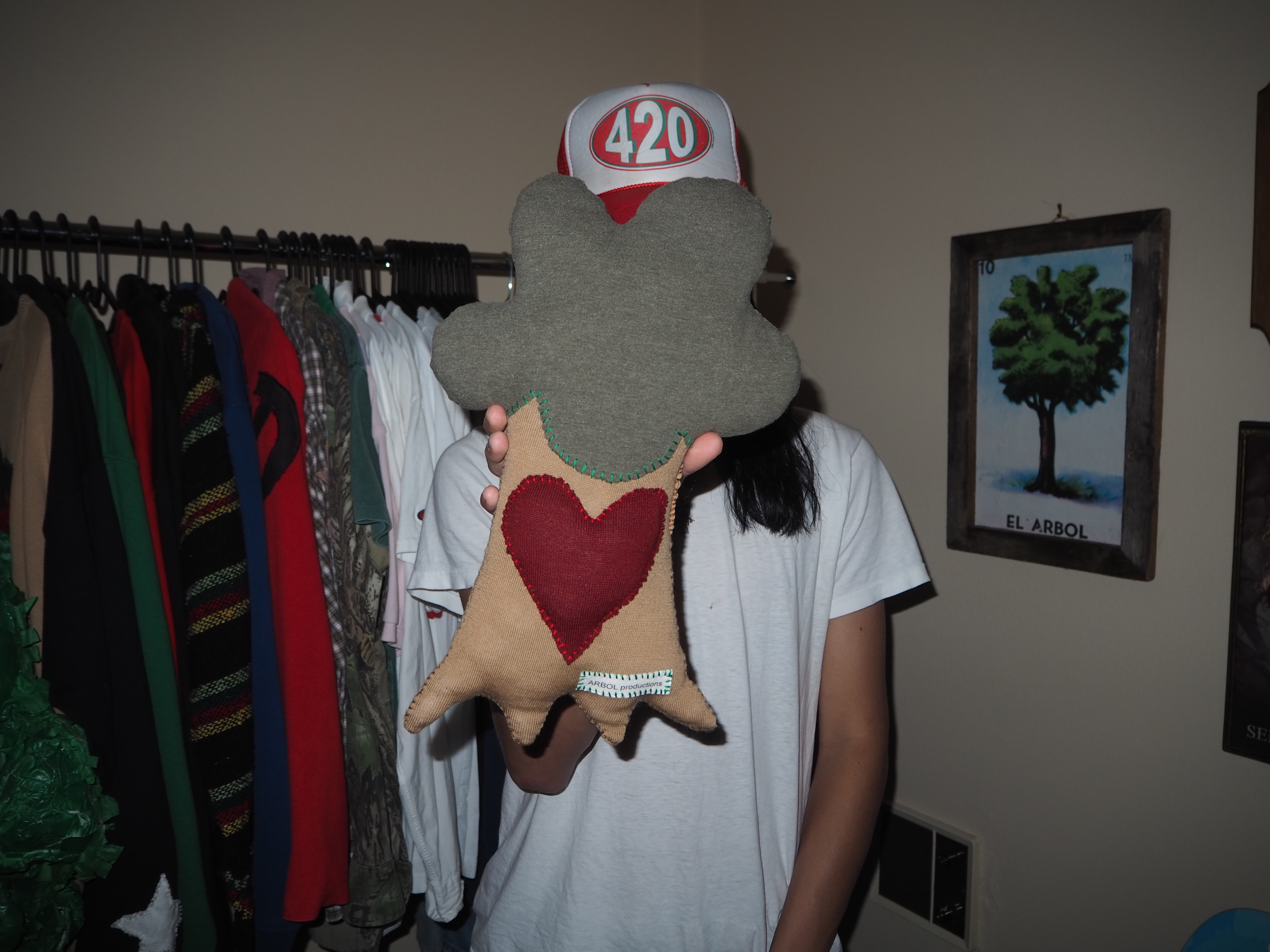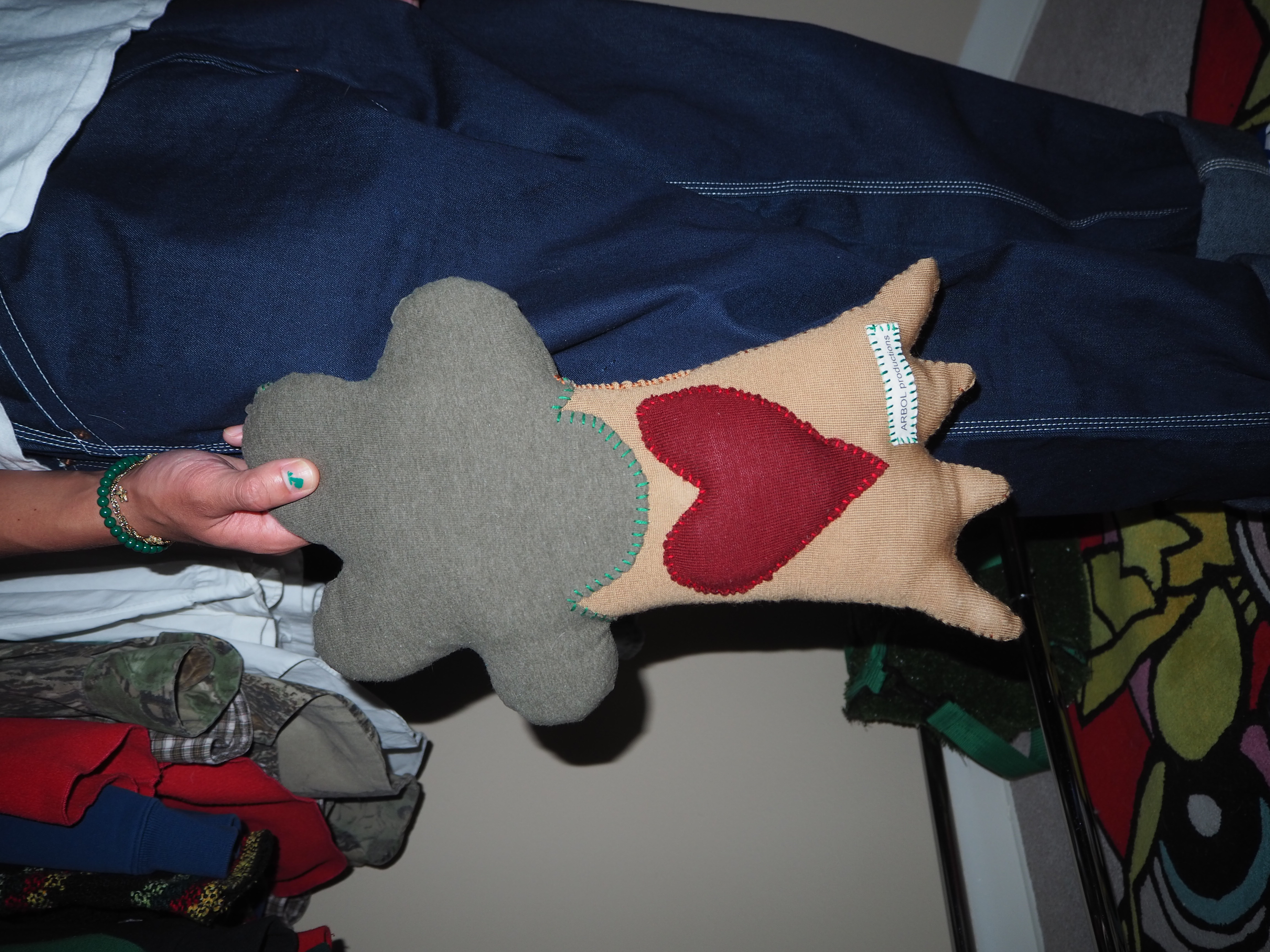 my second attempt at a plushie. a more handheld version of the big tree. heart on the trunk instead of the leaves. made from 100% recycled materials. 15” tall x 10” wide x 3” thick.
