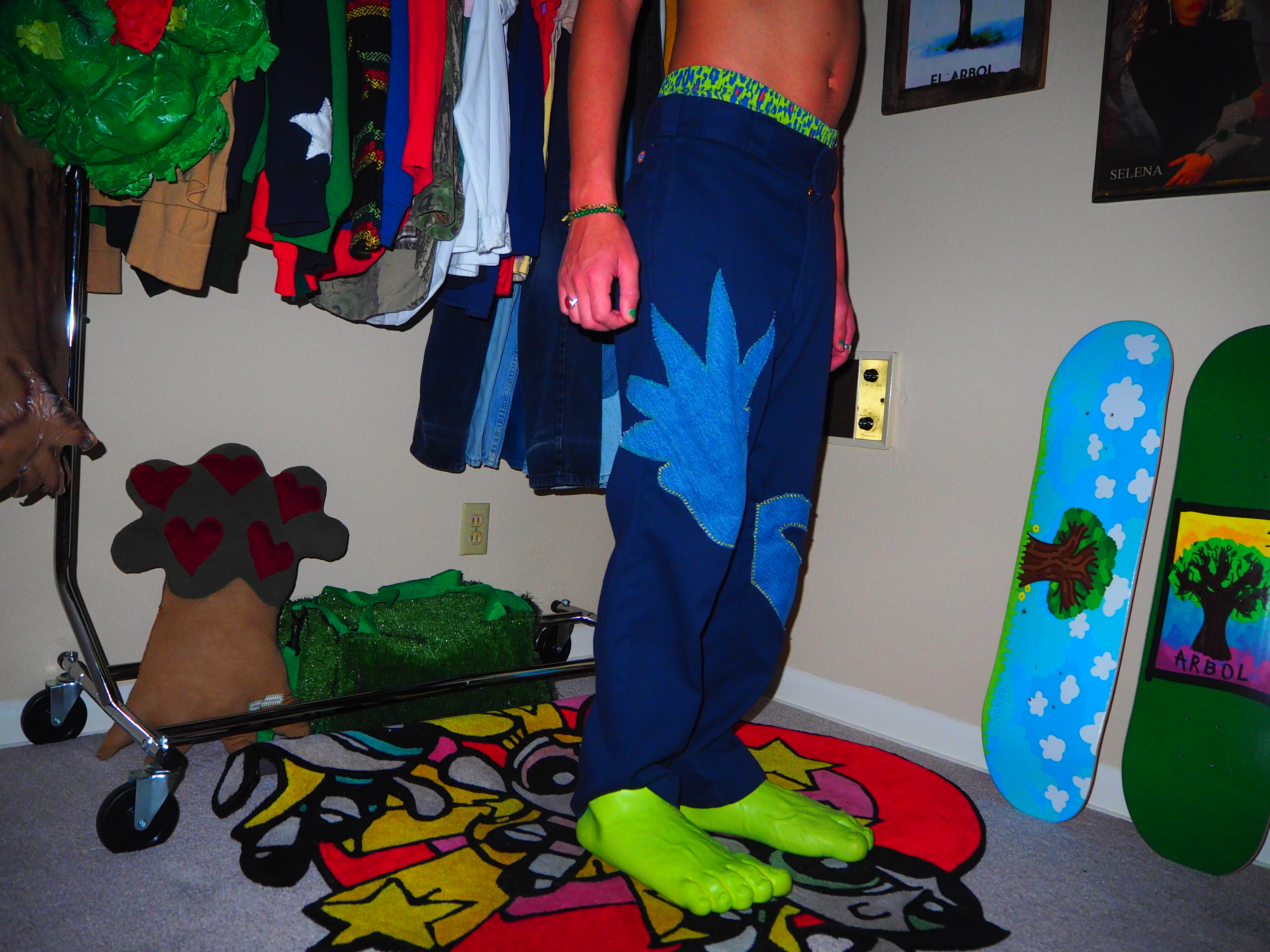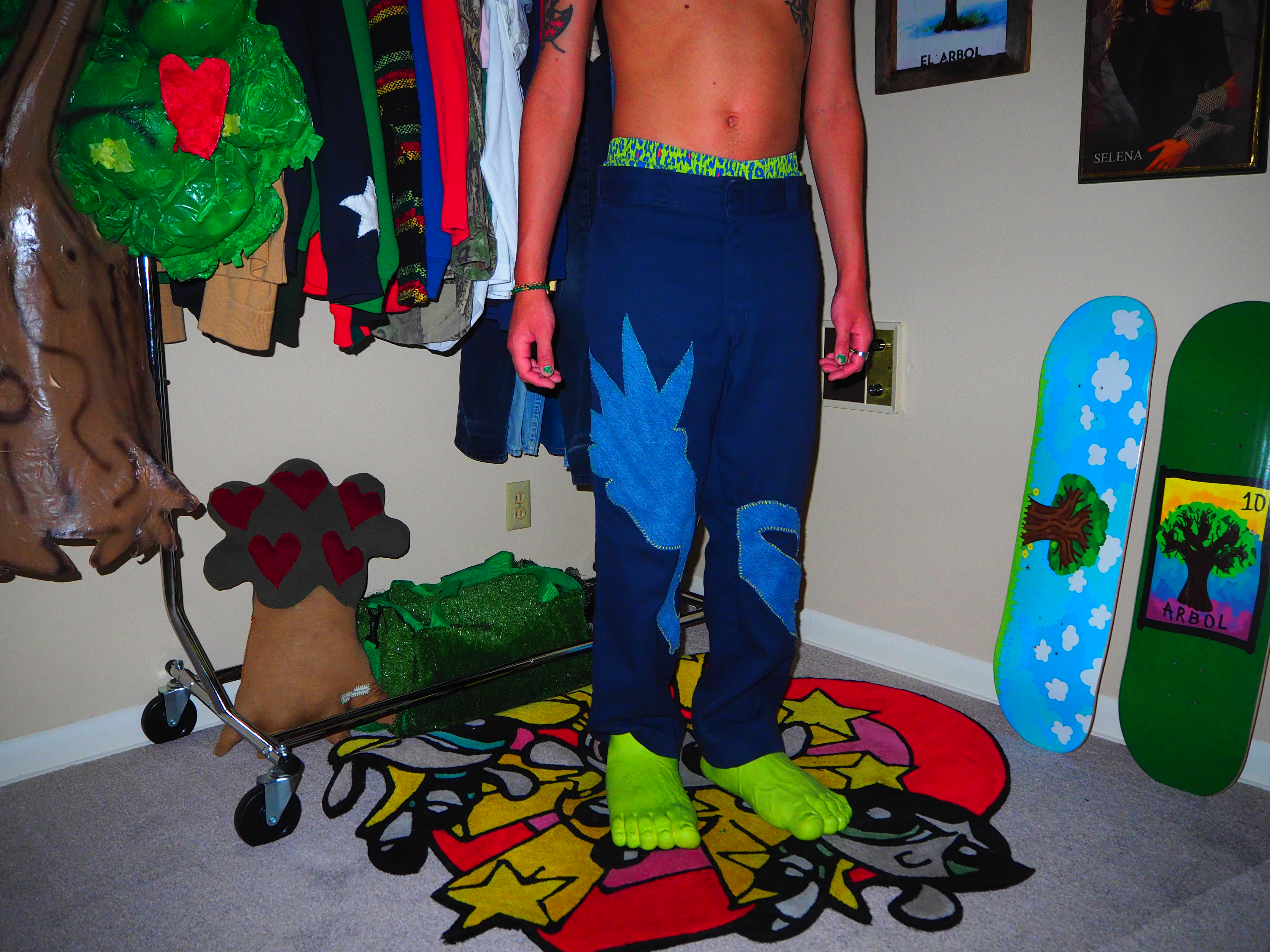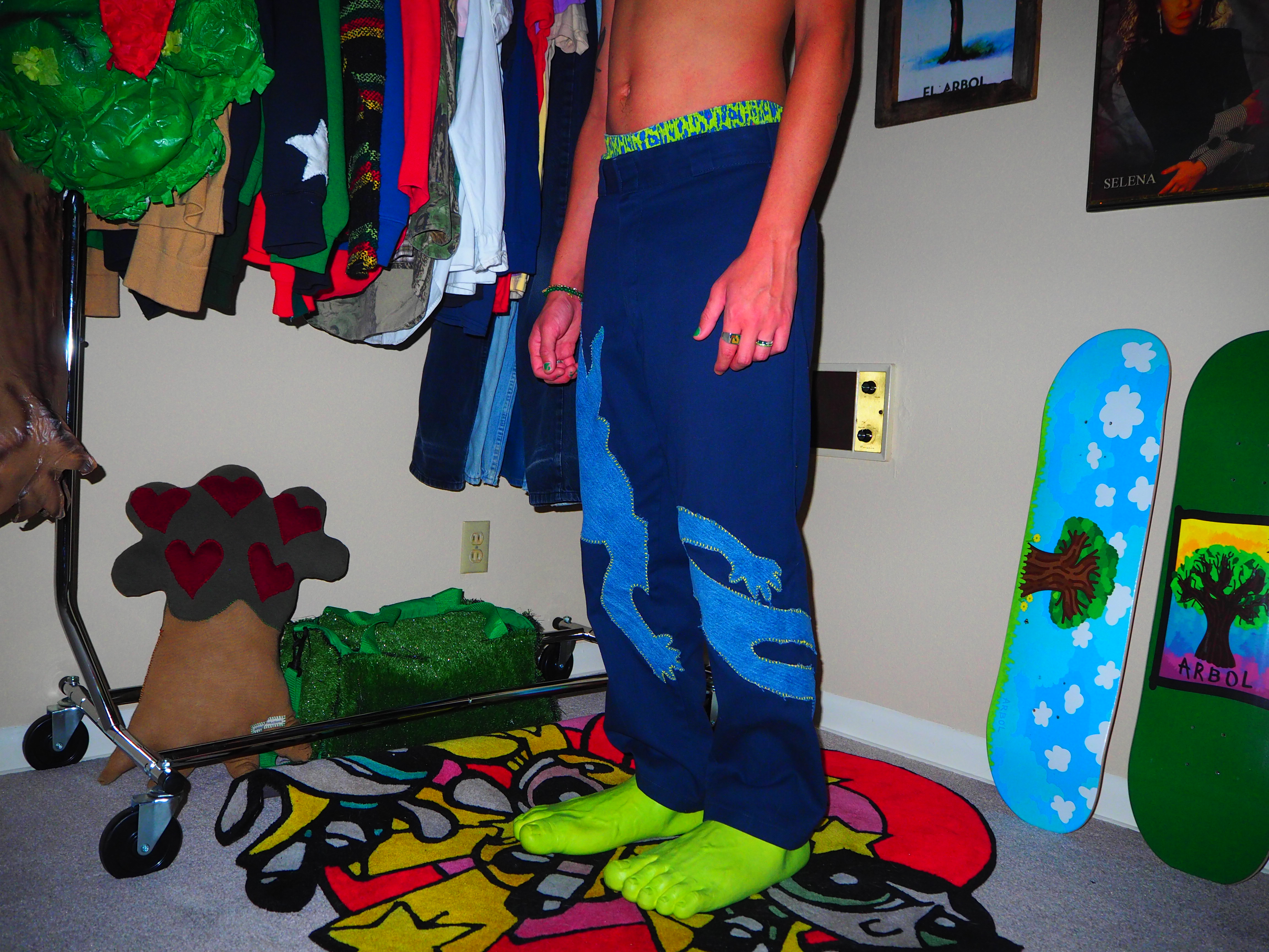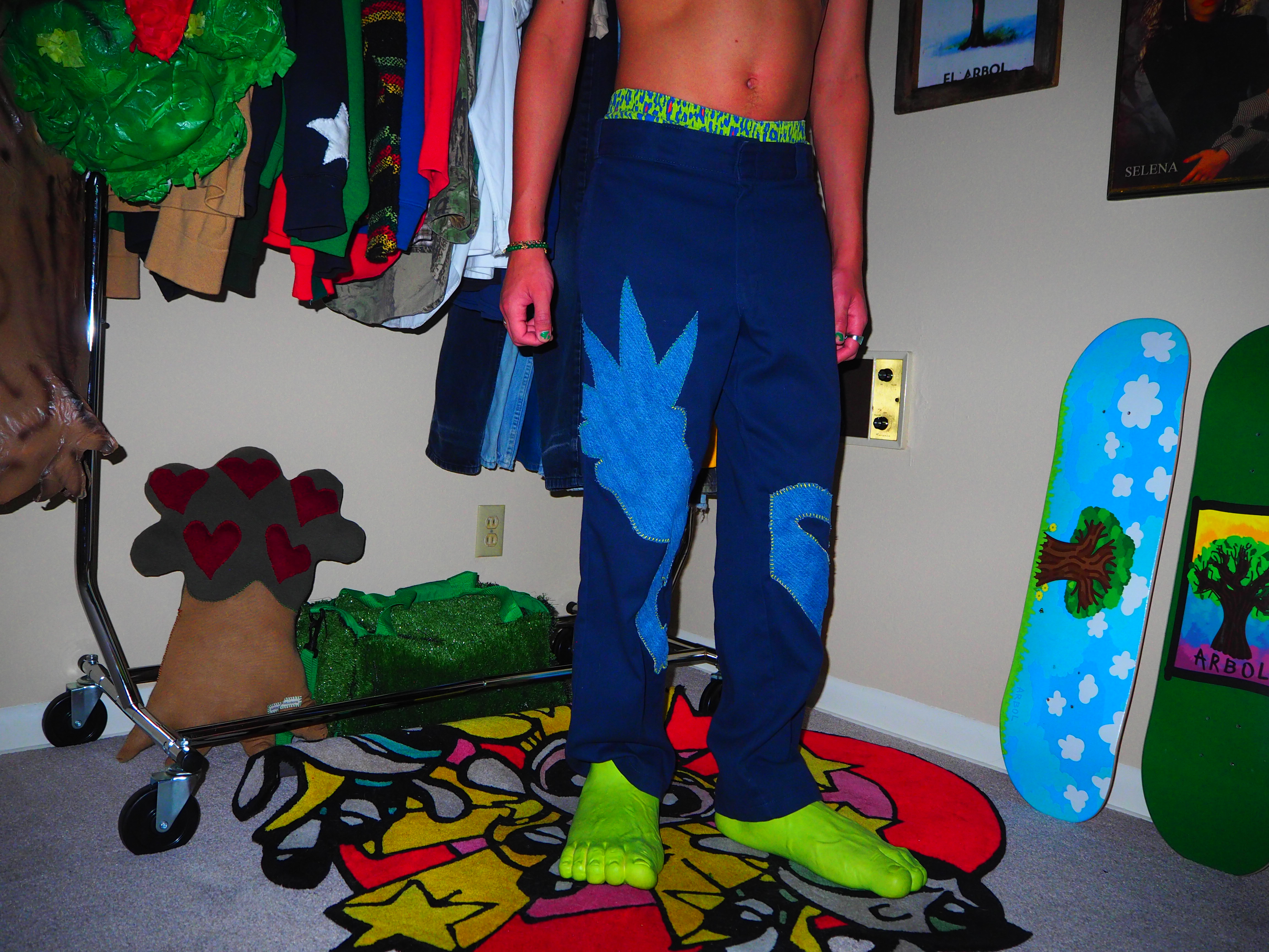 inspired by jamiroquai. this androgynous figure features green spiky hair, a yellow body, five fingers and shoes! navy 874 dickies, 33 x 30.