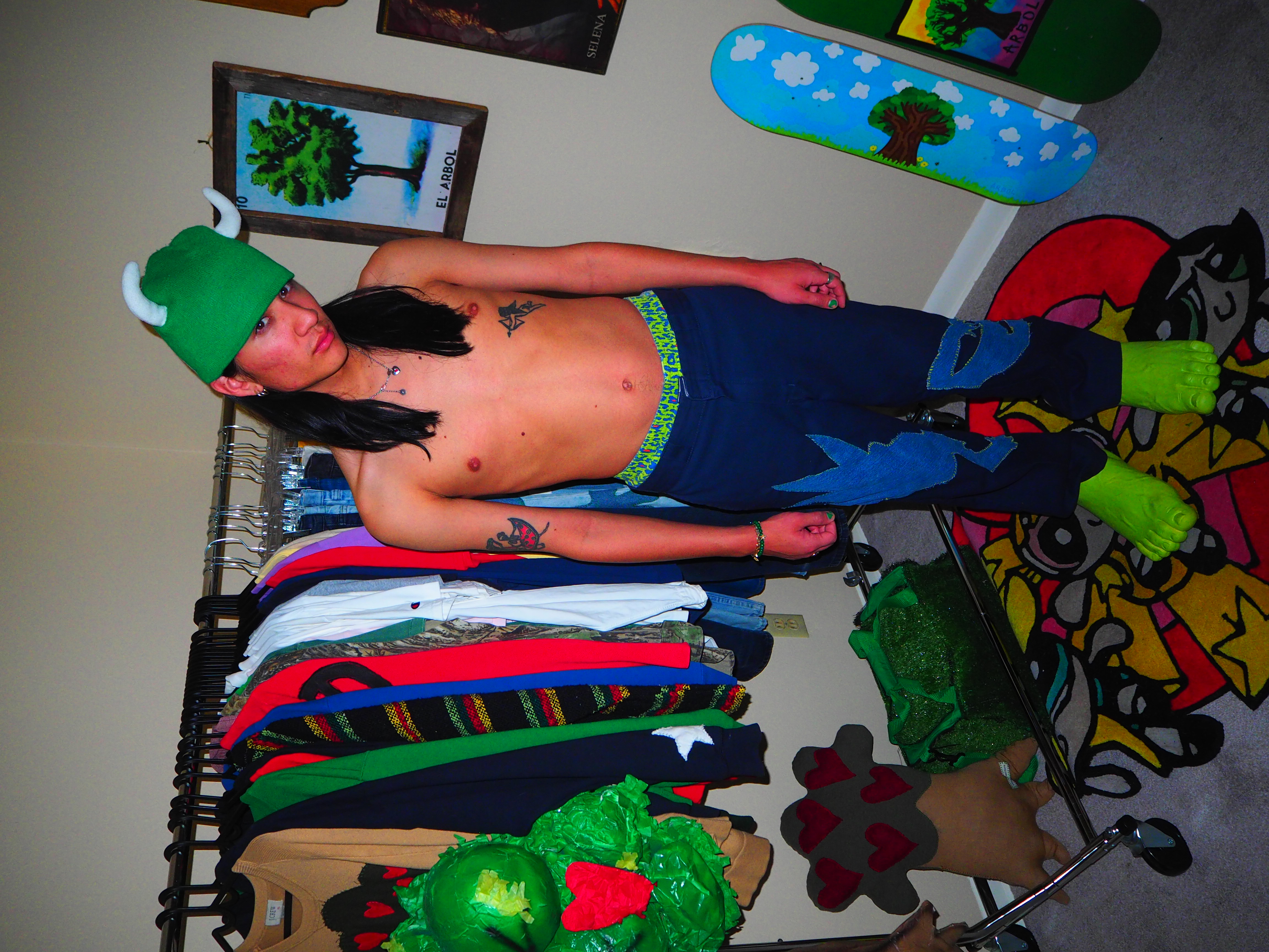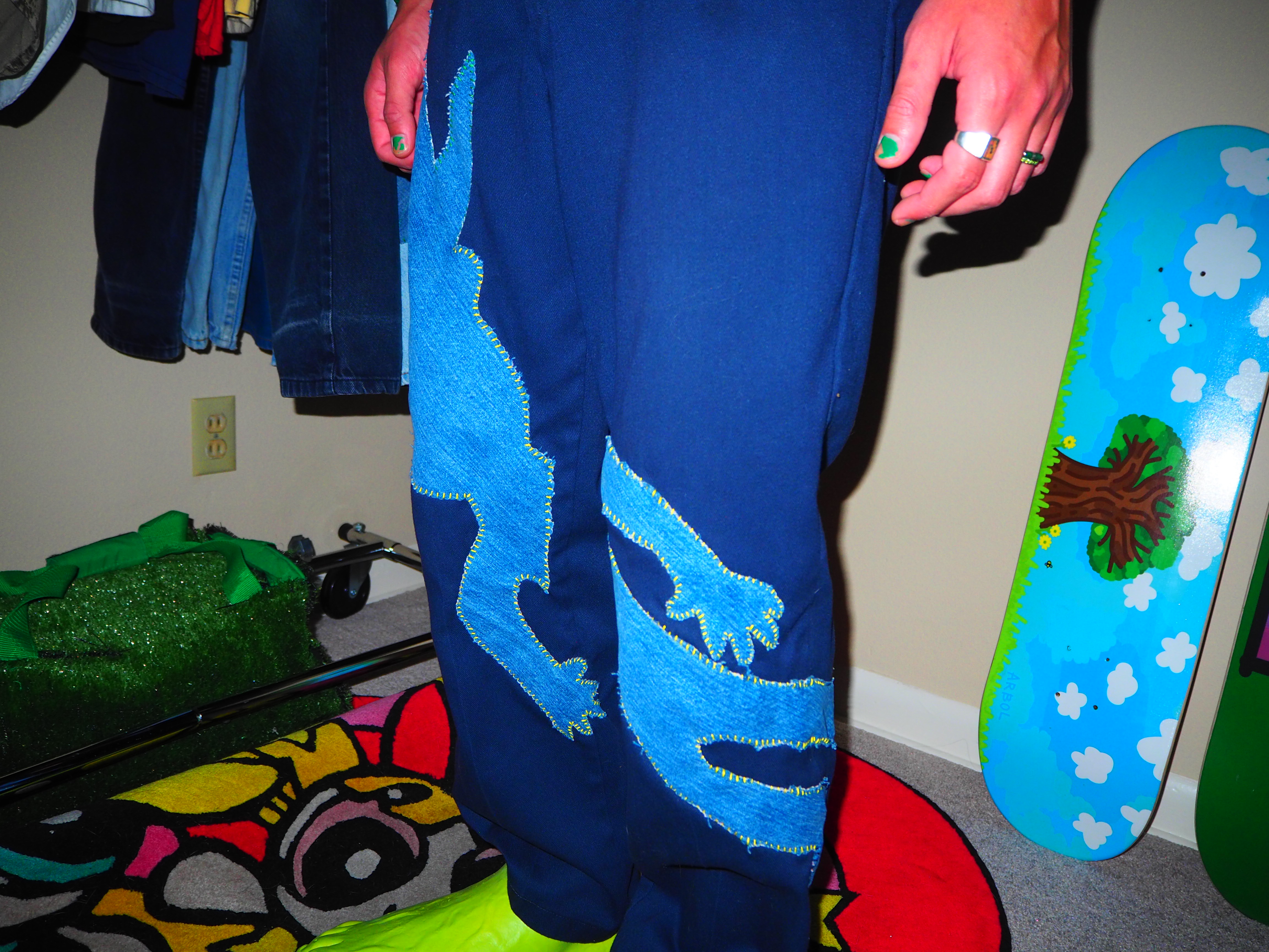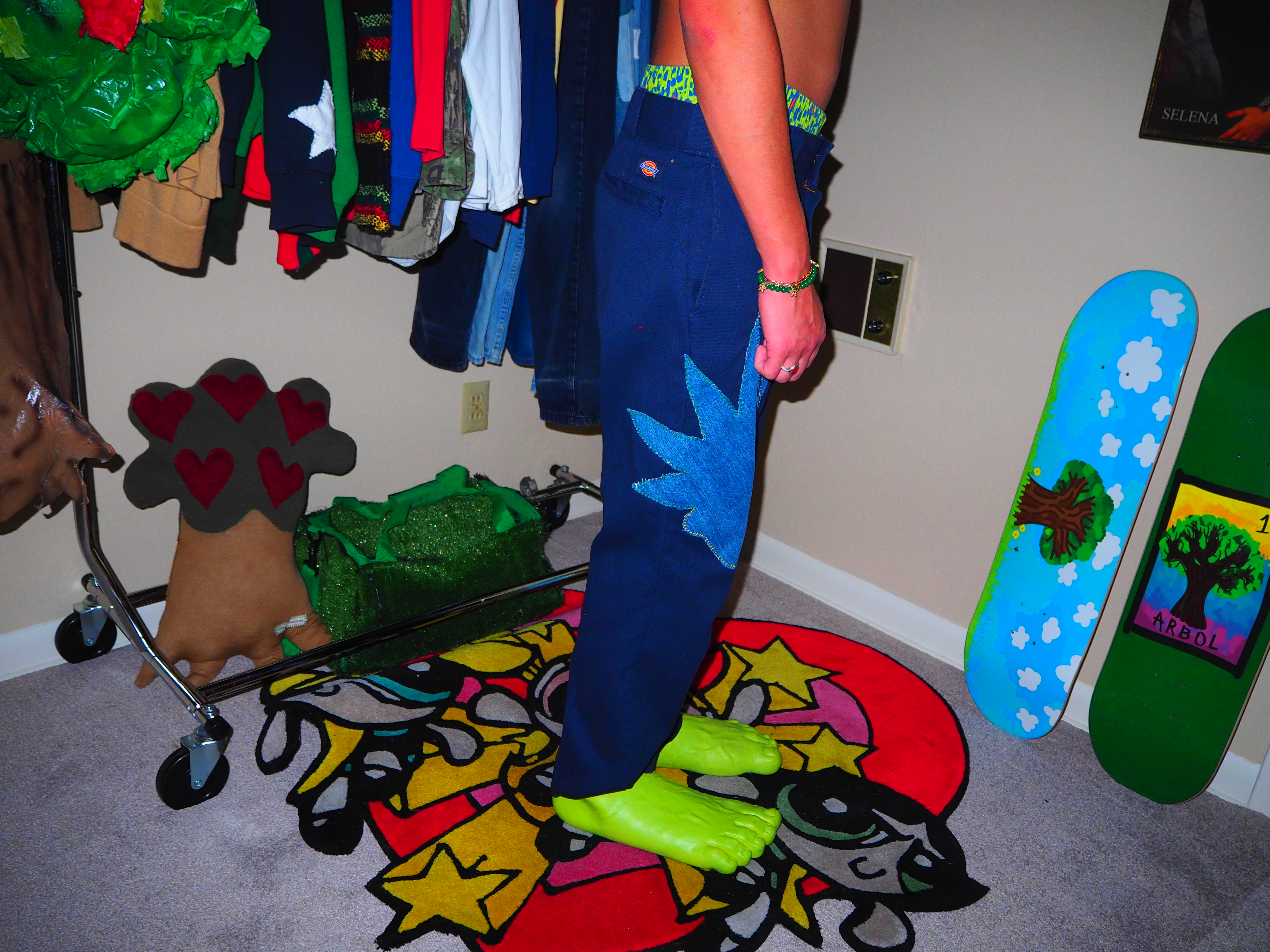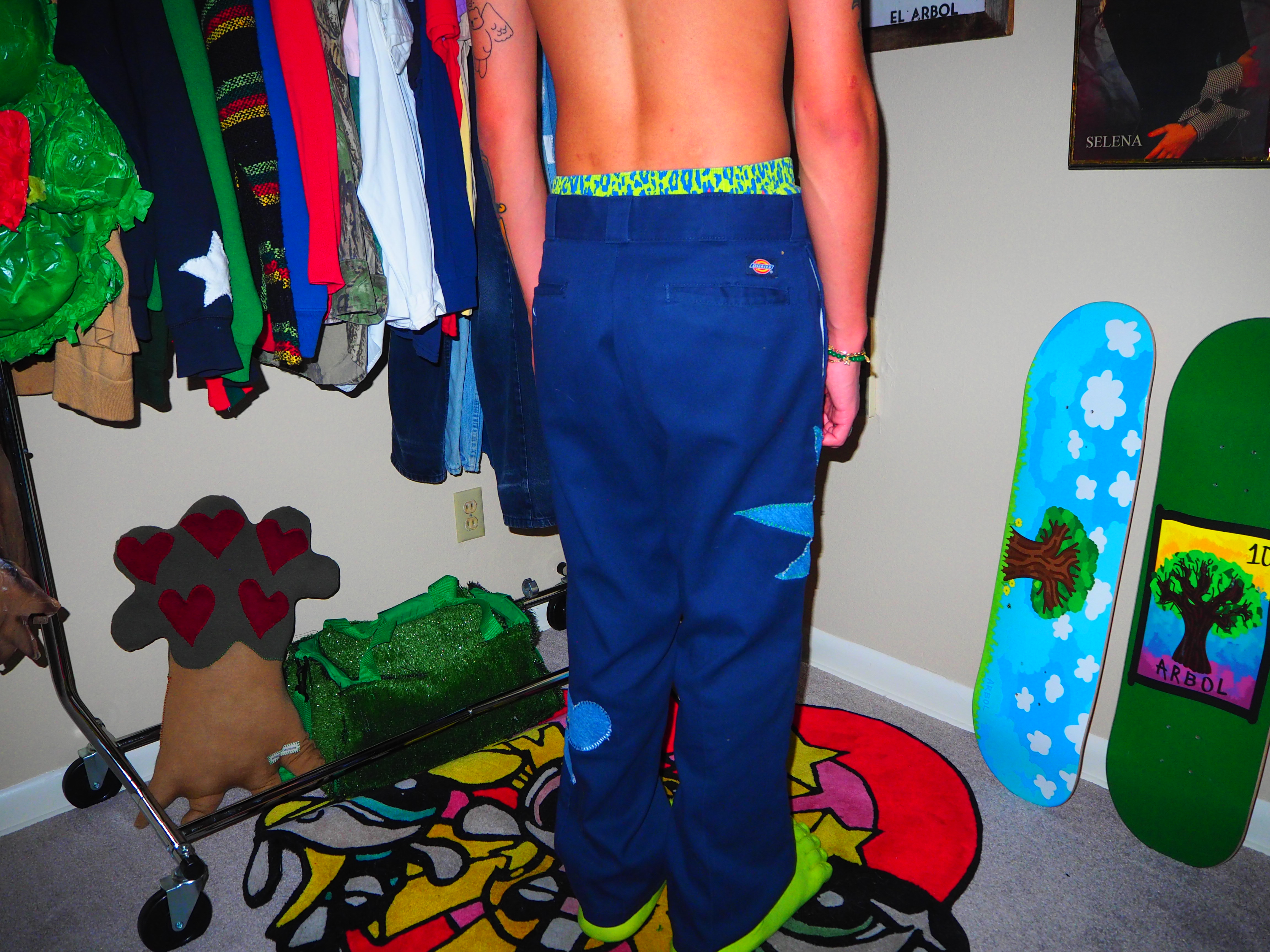 inspired by jamiroquai. this androgynous figure features green spiky hair, a yellow body, five fingers and shoes! navy 874 dickies, 33 x 30.