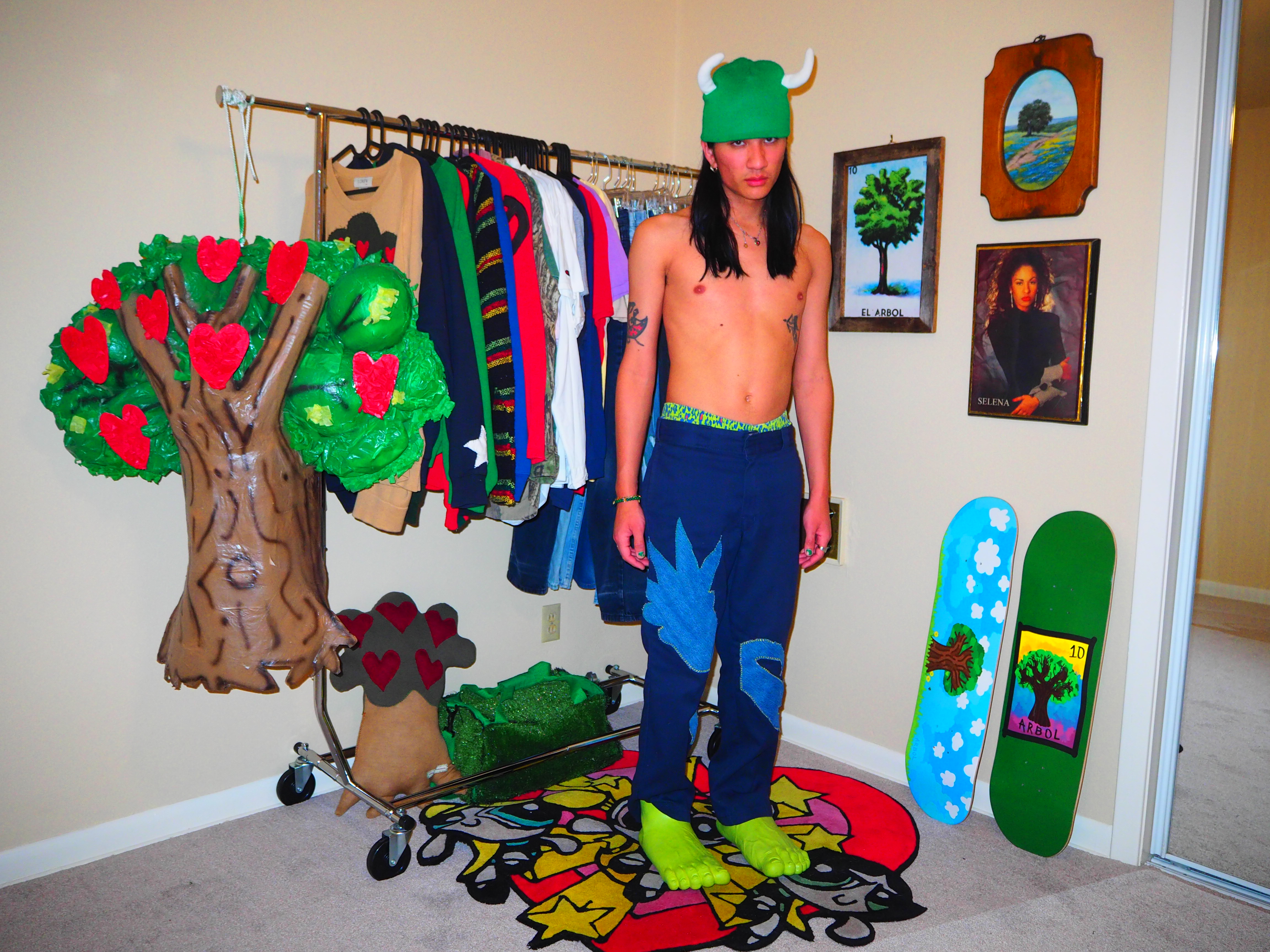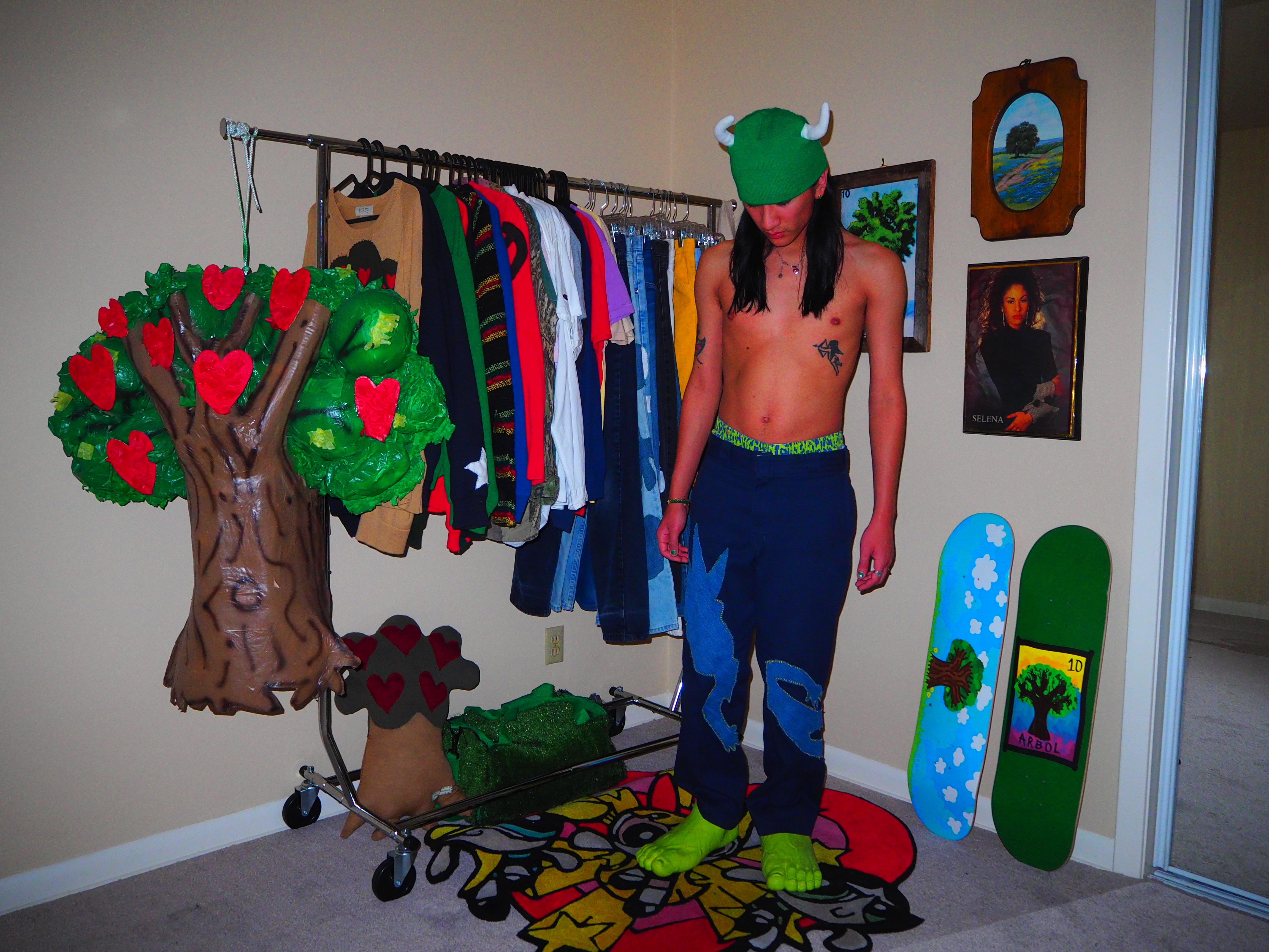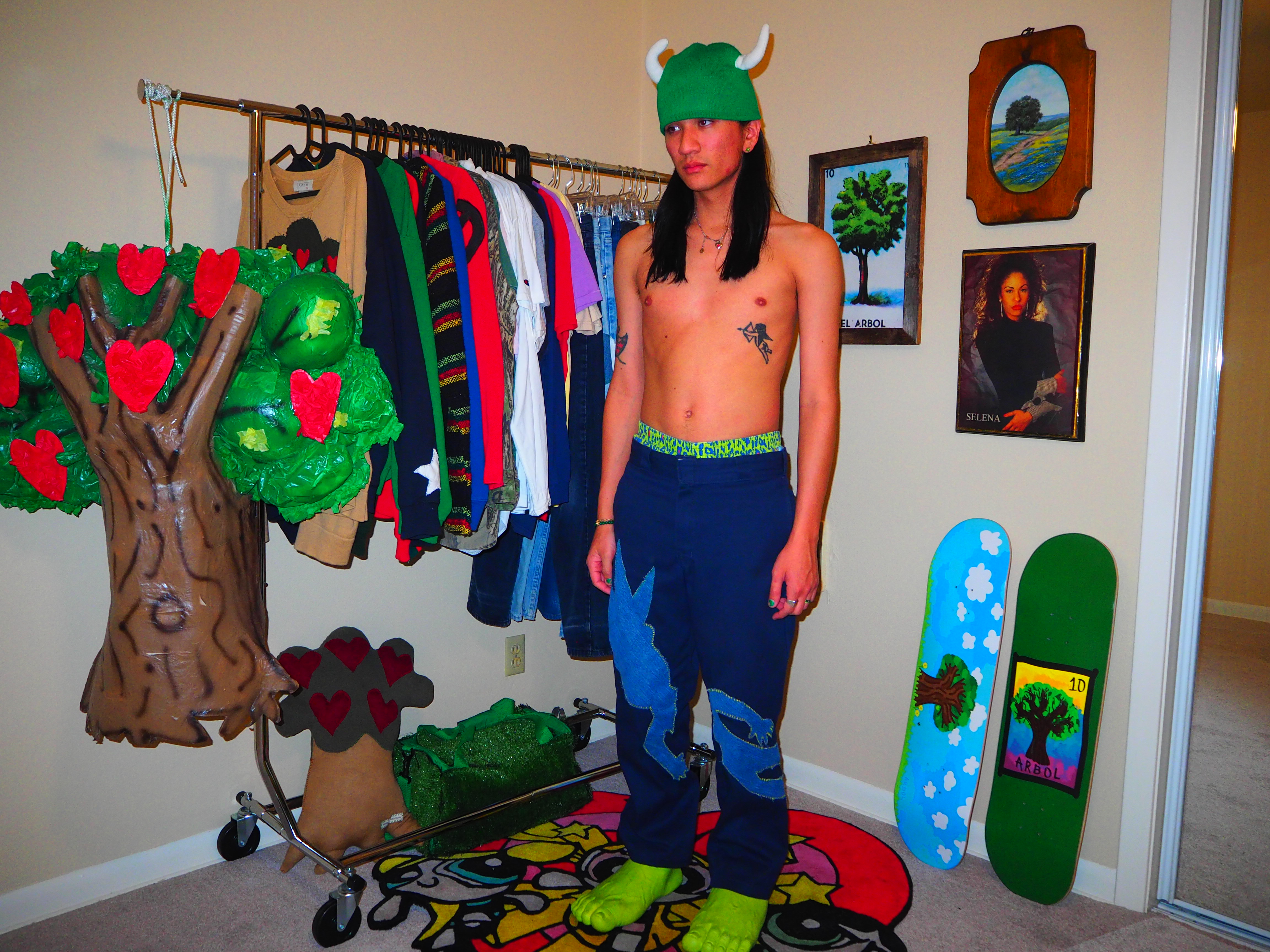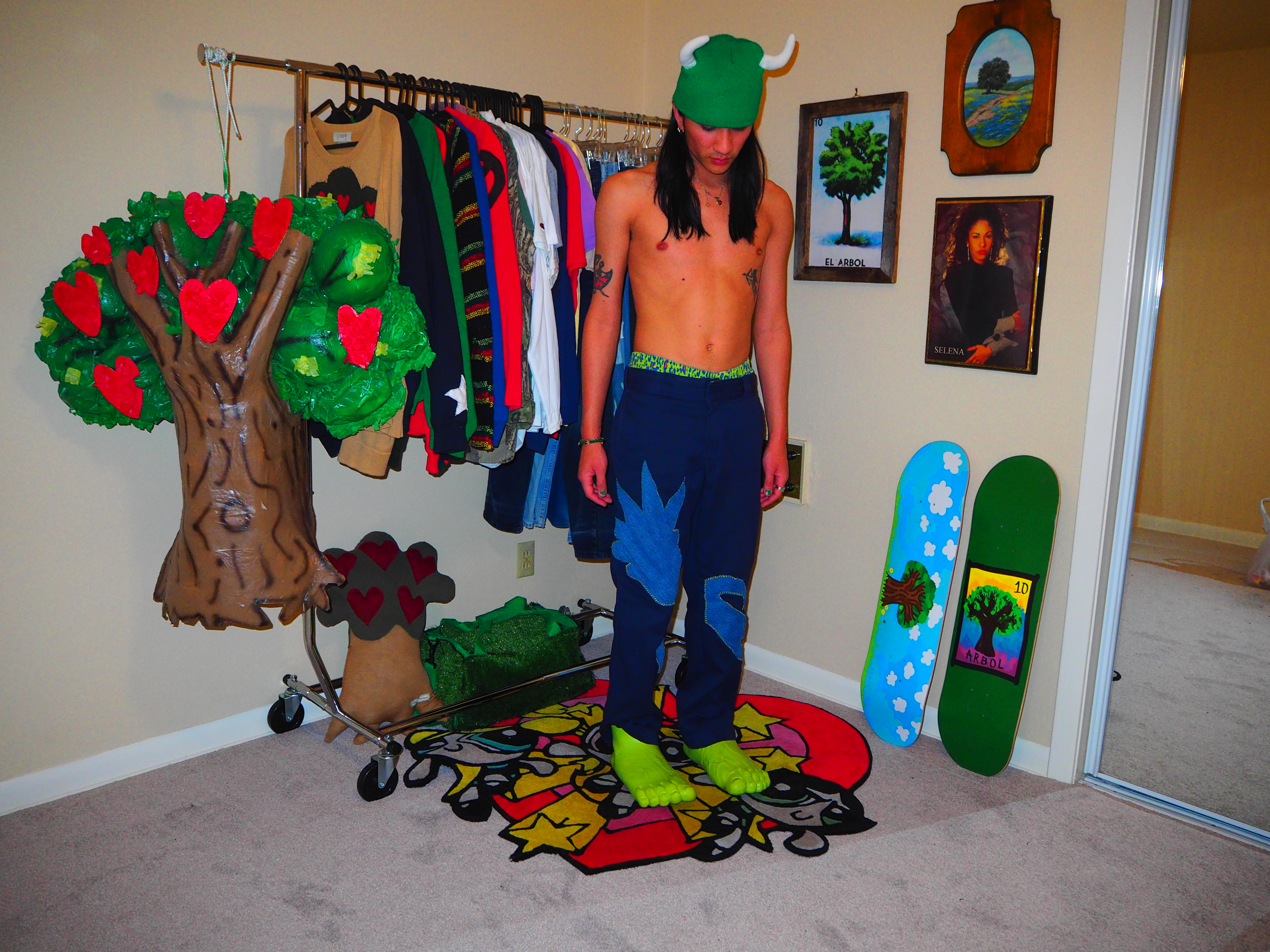 inspired by jamiroquai. this androgynous figure features green spiky hair, a yellow body, five fingers and shoes! navy 874 dickies, 33 x 30.