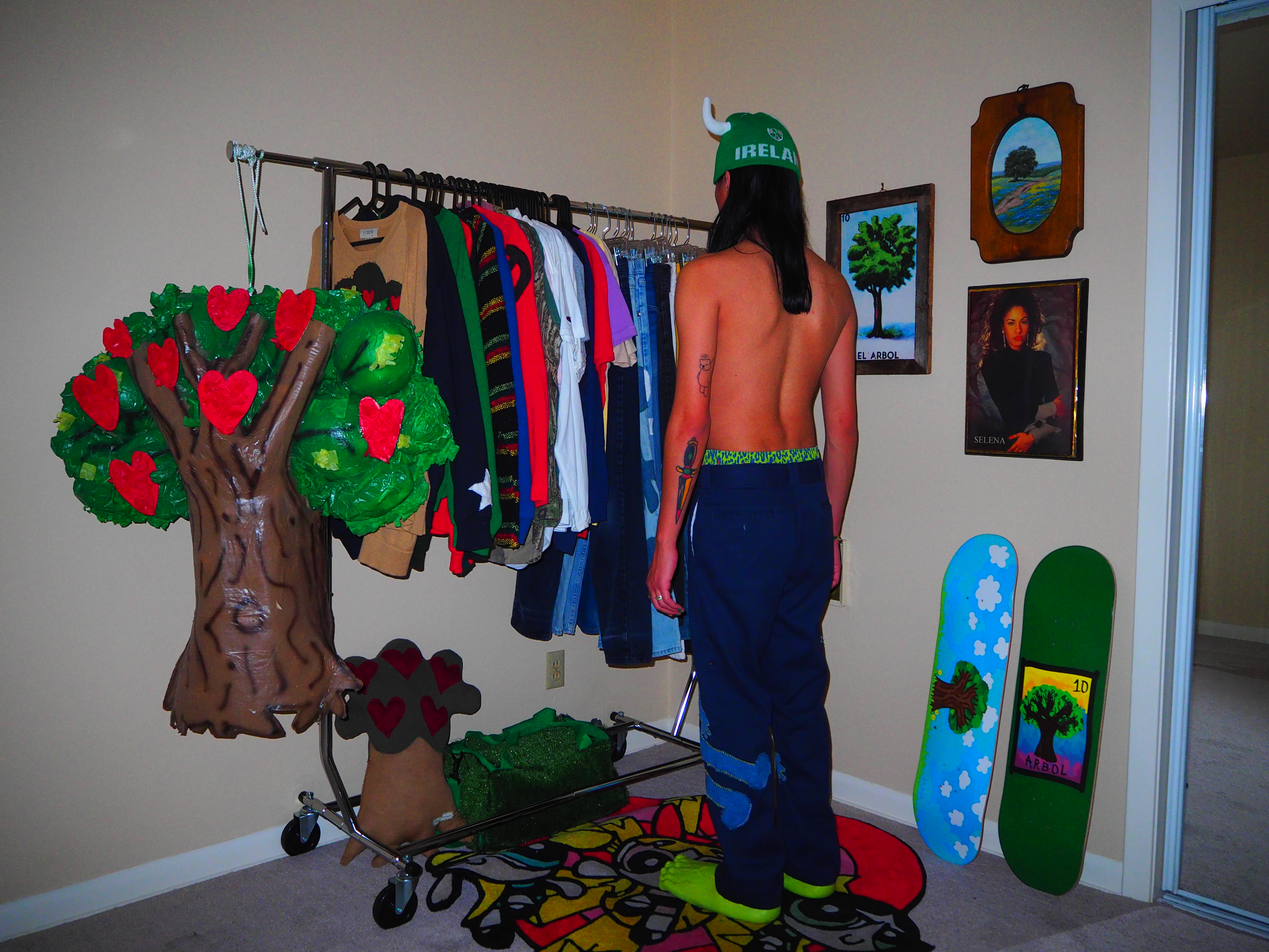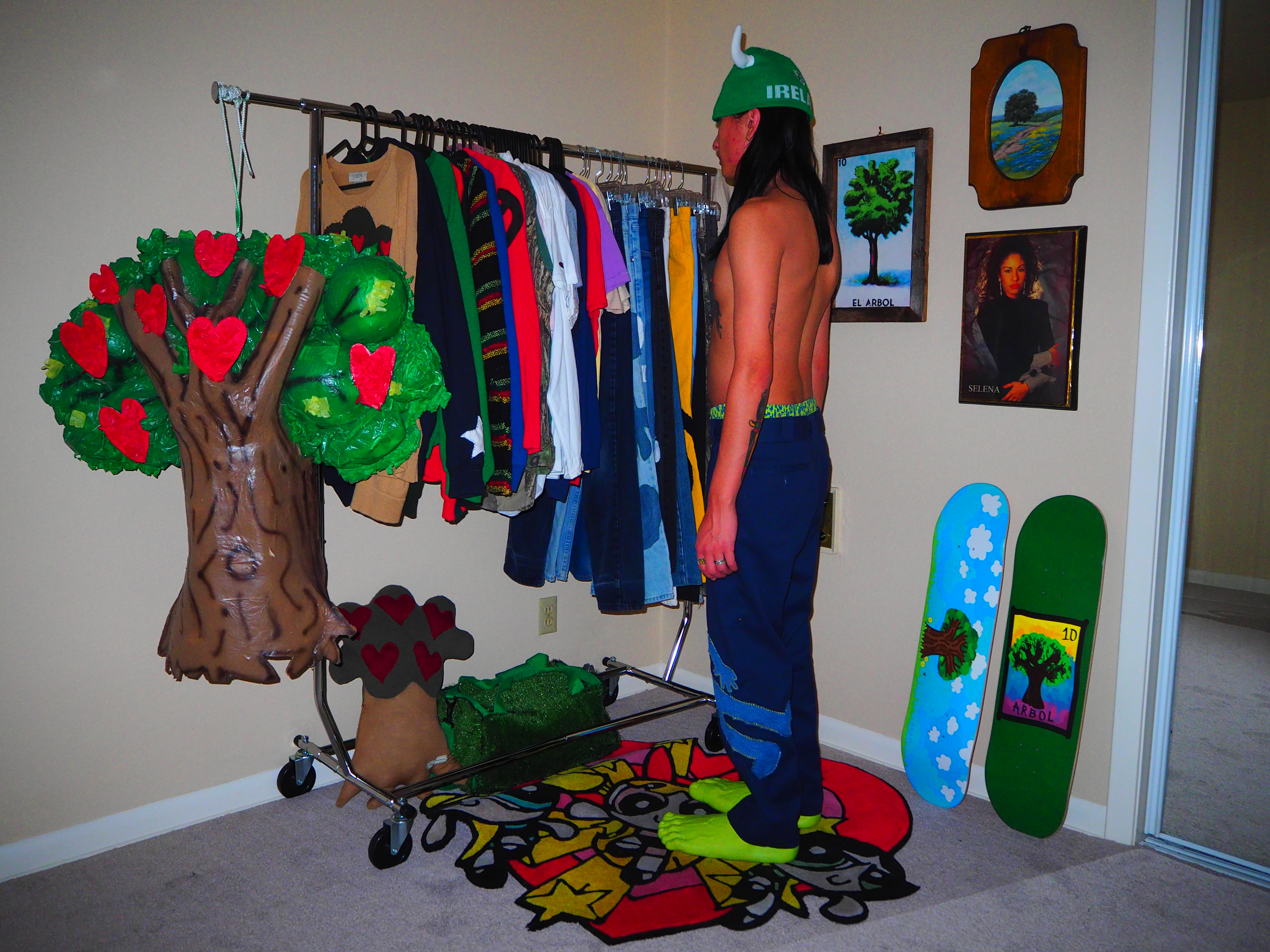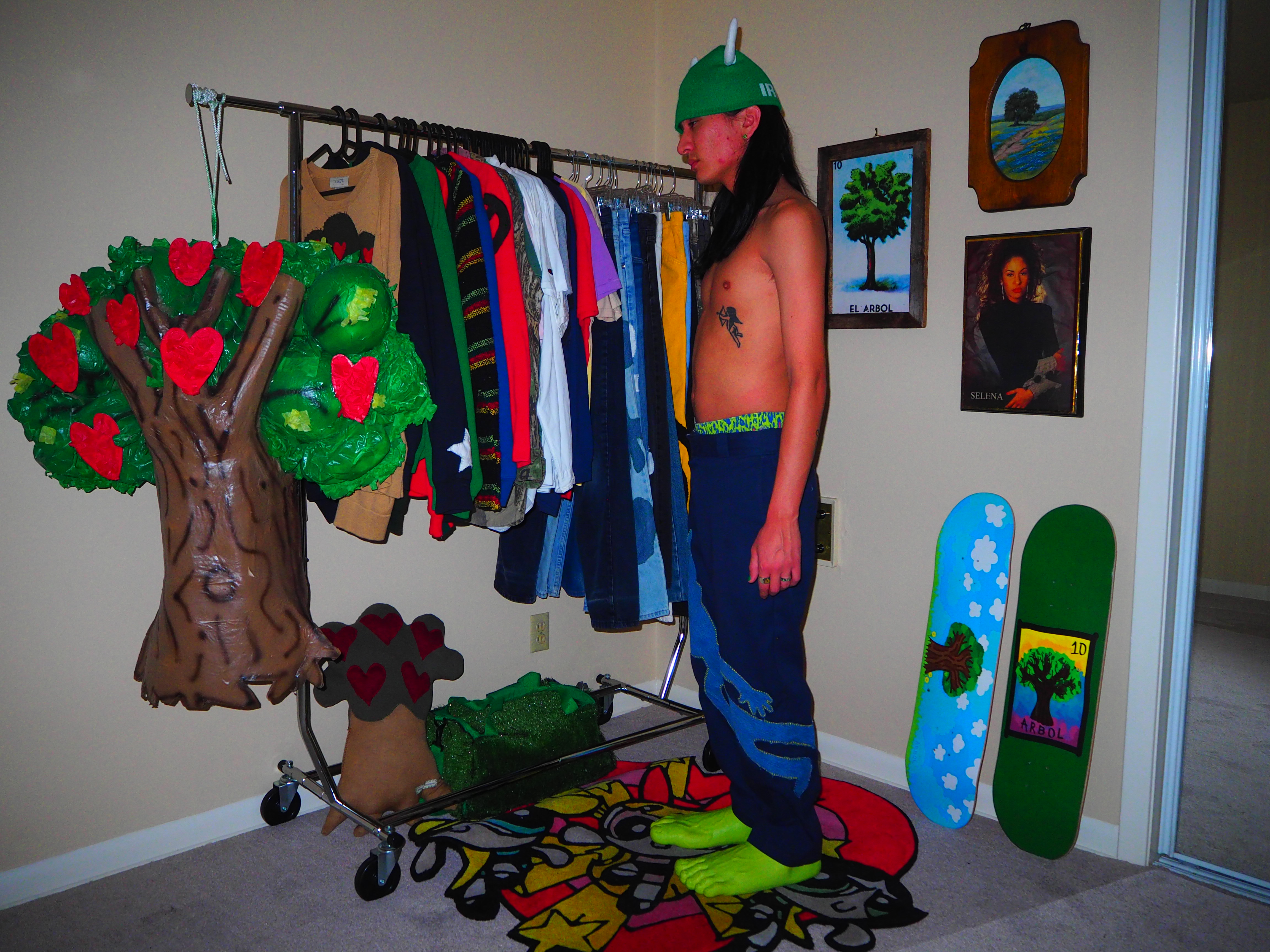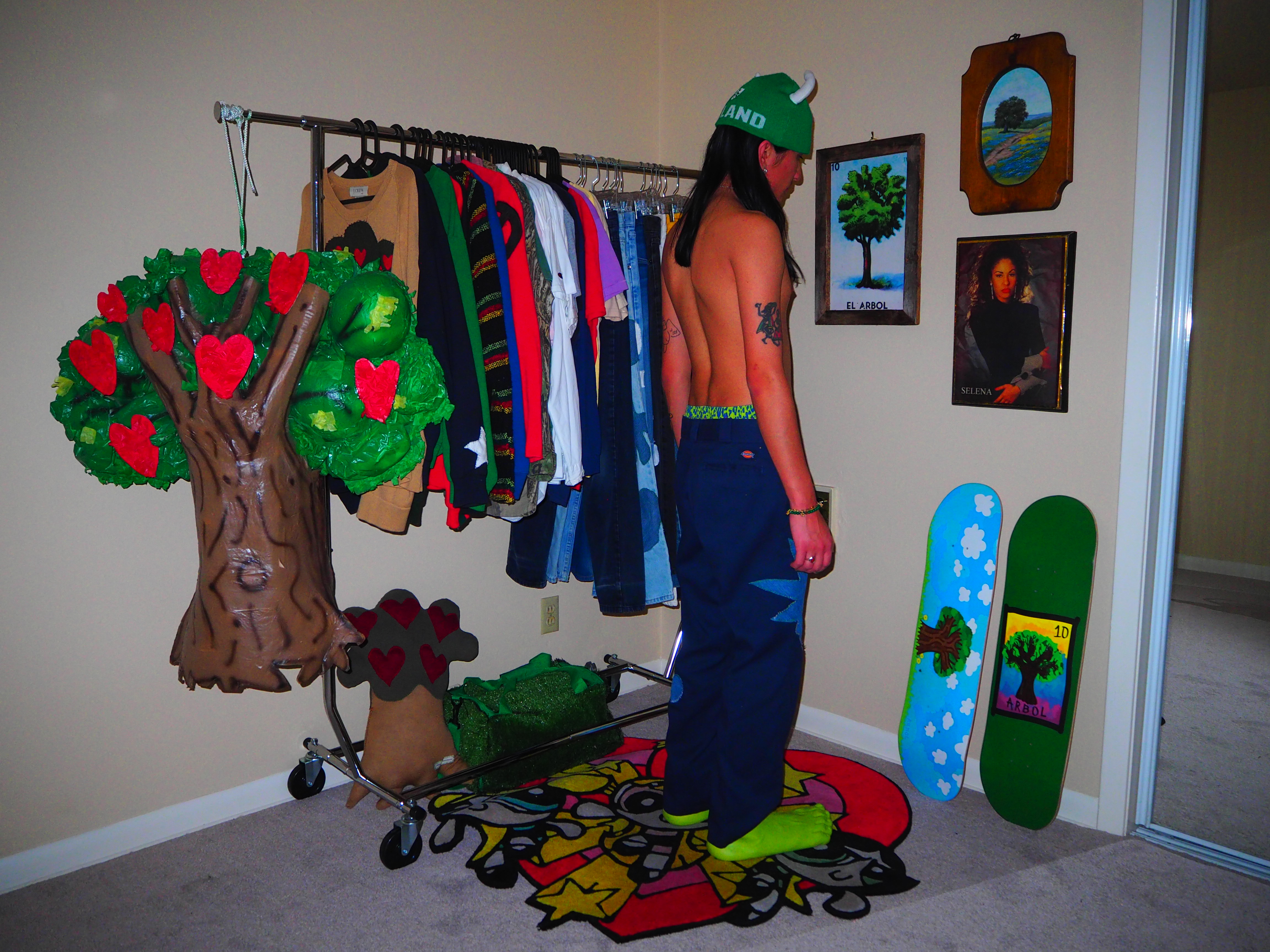 inspired by jamiroquai. this androgynous figure features green spiky hair, a yellow body, five fingers and shoes! navy 874 dickies, 33 x 30.