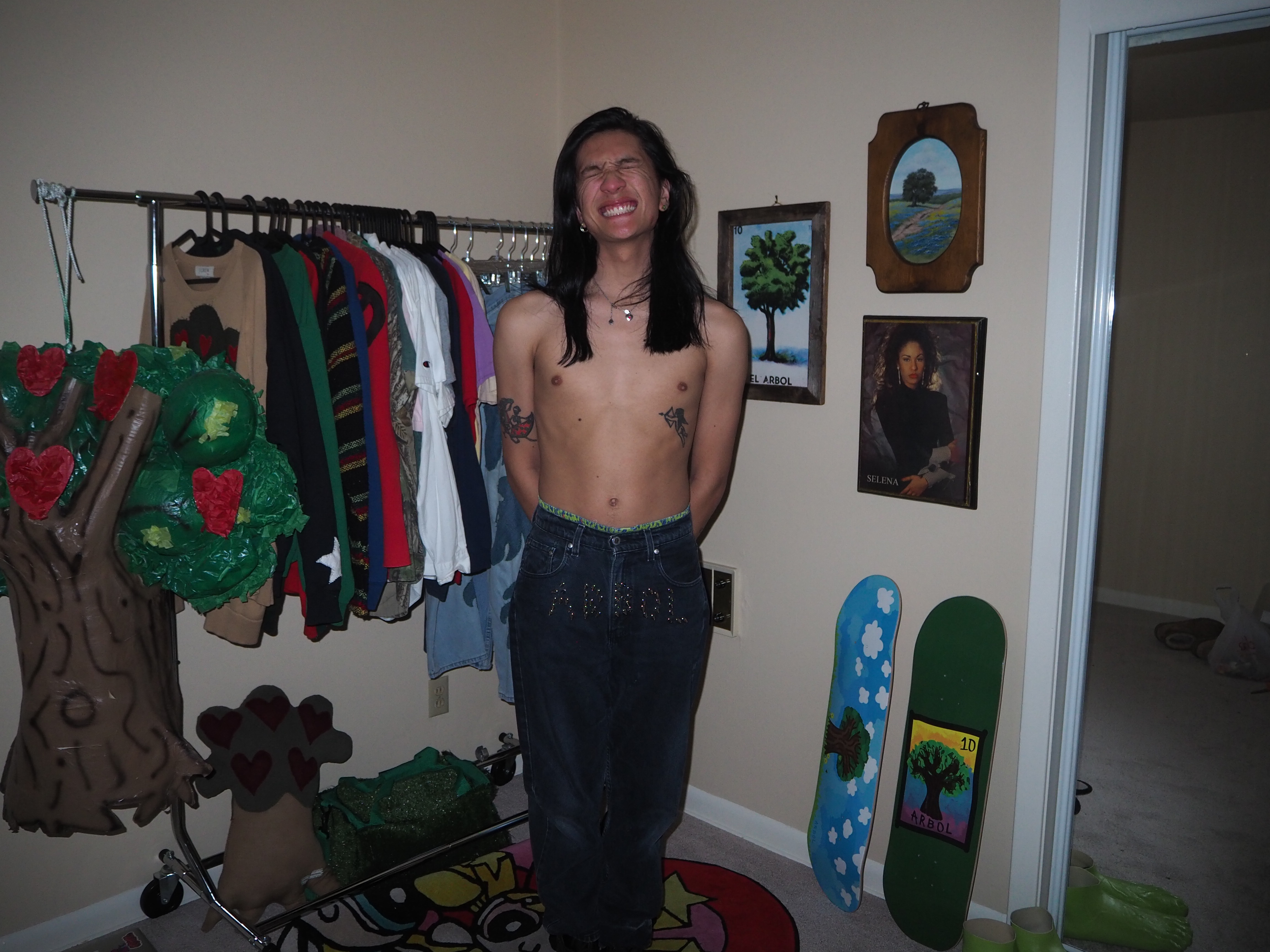 i made these for my 22nd birthday. traditionally i do denim on denim, but for these i had to do something different. first time working with studs, each one hand set and screwed. reads “arbol” across the crotch. on loose fit silver tab levi’s from the 90s. “women’s size 5/6”, best fits 28 inch waist.